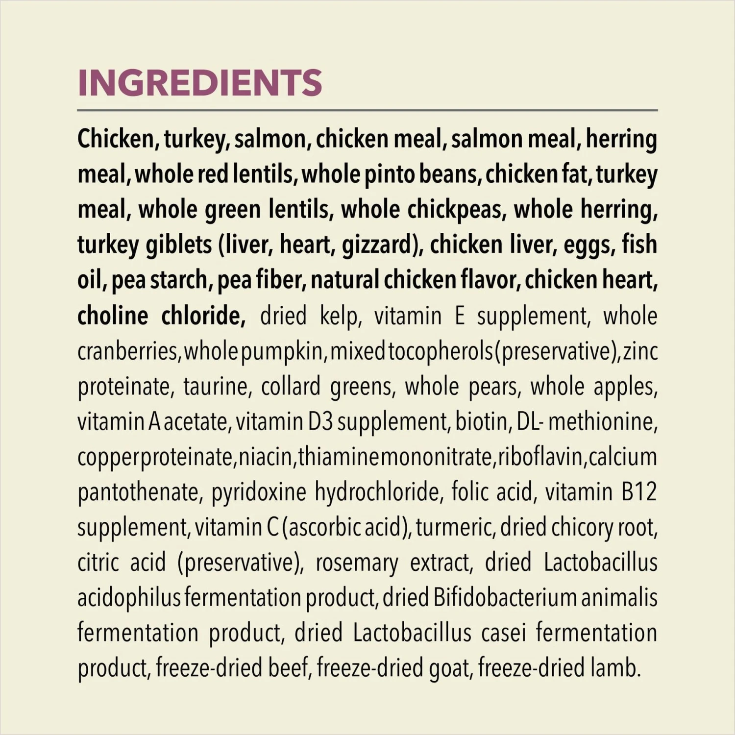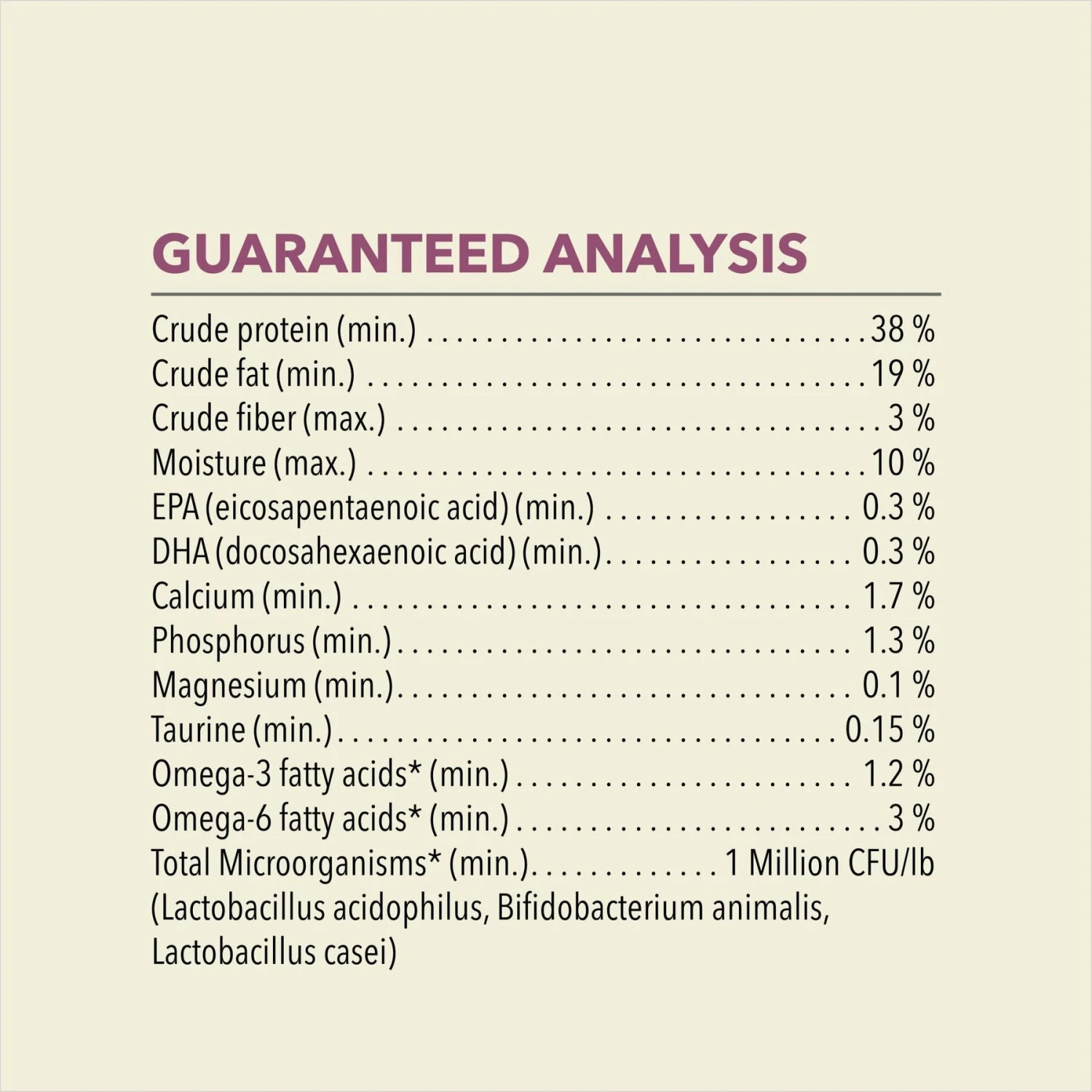 - Contains up to 75% animal ingredients, plus fiber and a probiotic blend for digestive support.