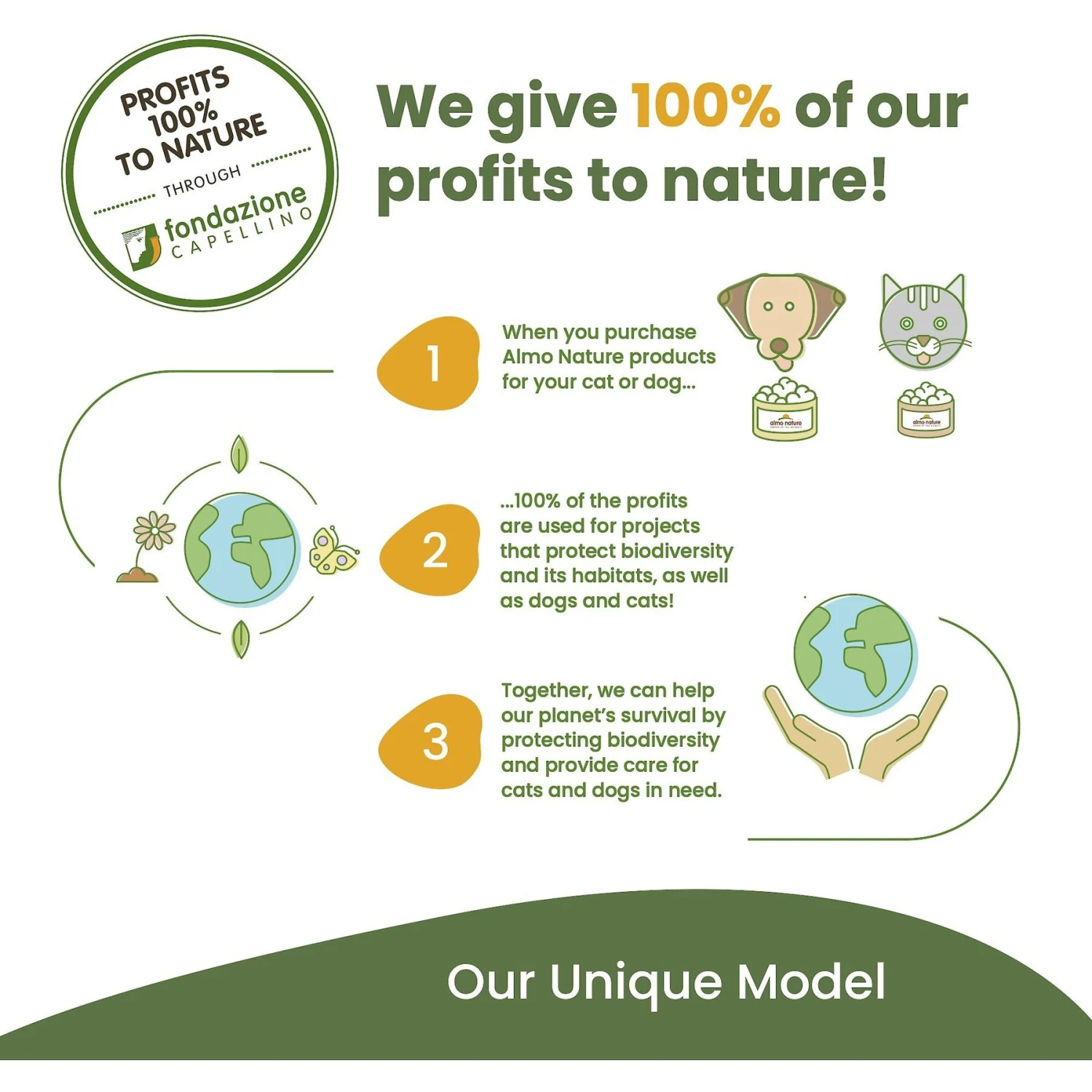 - 100% of the profits from Almo Nature product sales (after expenses and taxes) go toward Amo Nature’s mission to protect biodiversity and fight against climate change.
