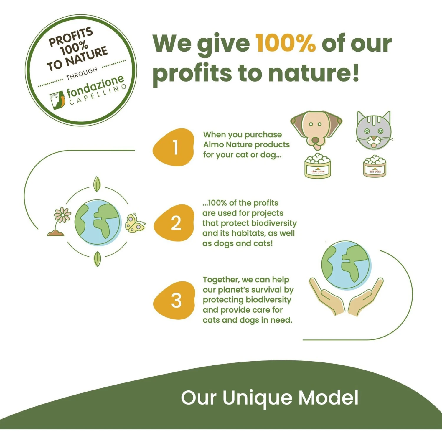 - 100% of the revenue from the sale of Almo Nature products is allocated to biodiversity restoration.