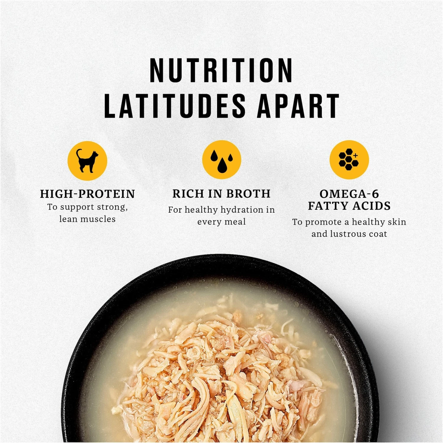- Based on a prey-based, feline-appropriate diet with real, shredded chicken and turkey in a savory broth.
