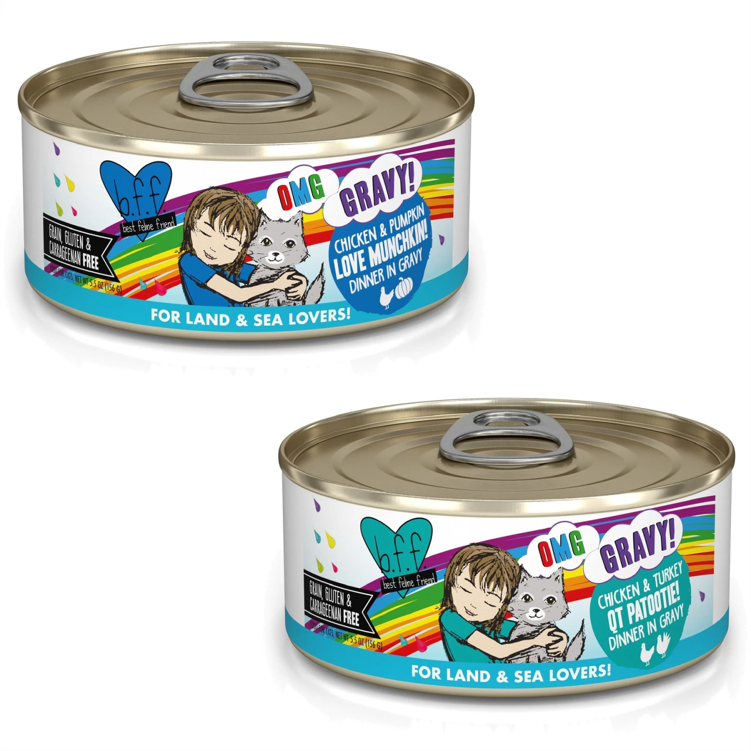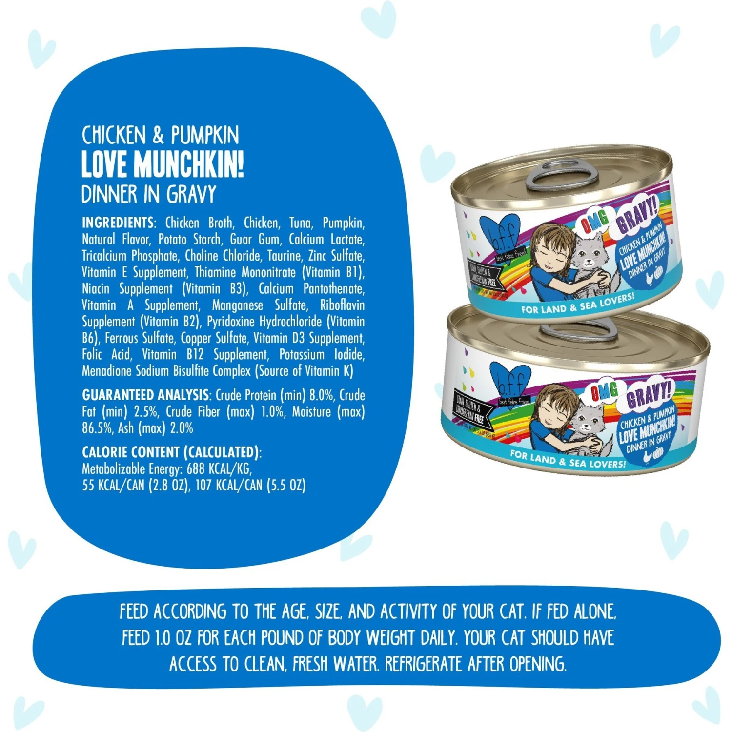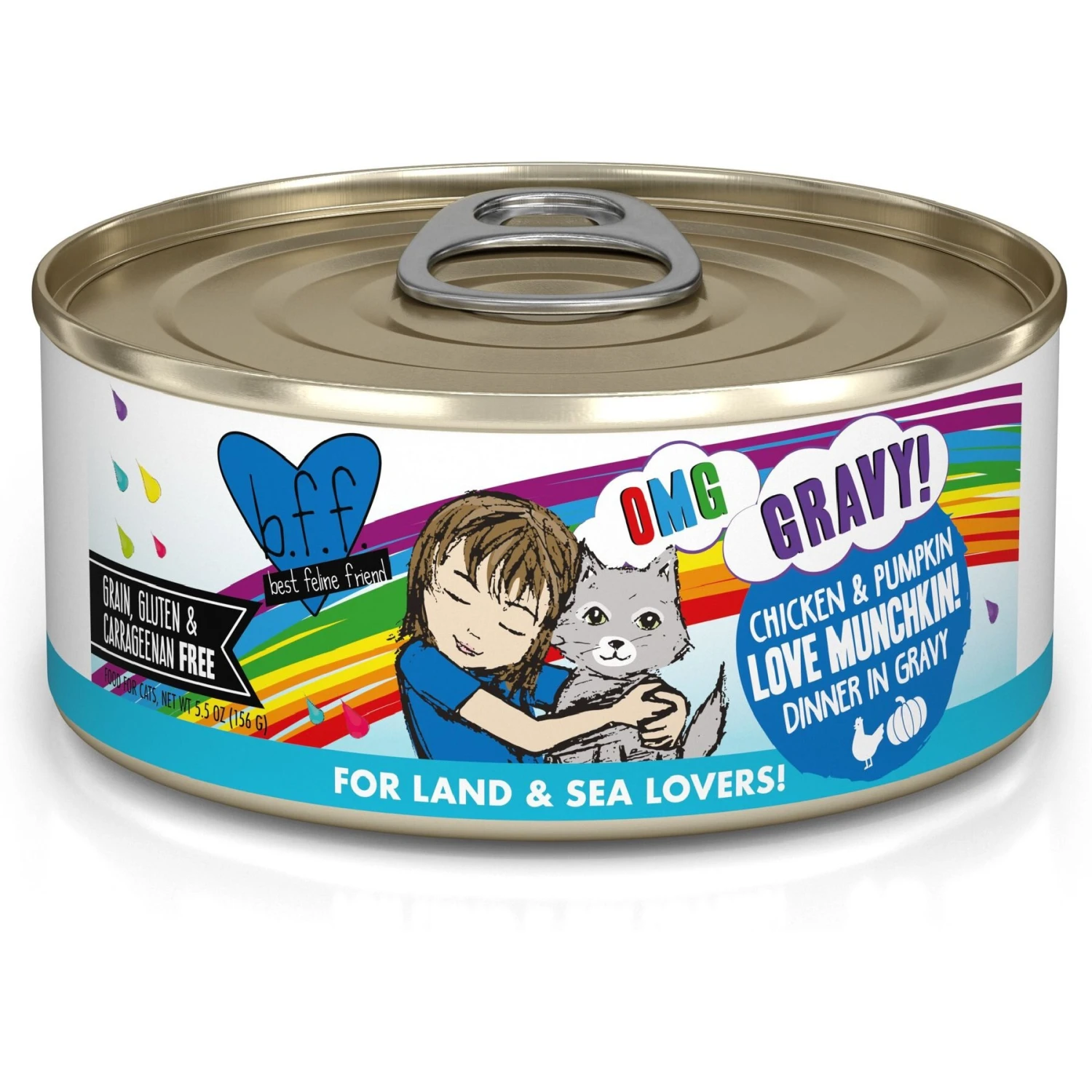 BFF OMG Love Munchkin! Chicken & Pumpkin Dinner in Gravy Grain-Free Canned Cat Food, 5.5-oz, case of 8—Turn meal time into yum time for your best feline friend with the BFF OMG Love Munchkin! Chicken & Pumpkin Dinner in Gravy Grain-Free Canned Cat Food. Made with chicken broth, chicken, tuna and pumpkin as the top ingredients, plus essential vitamins and minerals, it provides a gravylicious and balanced diet for adult kitties. Since it’s packed with broth, it’s a great way to add much-needed hydration to keep your pal healthy. Plus, it’s made with sustainably sourced ingredients in high-quality food facilities with nothing artificial.