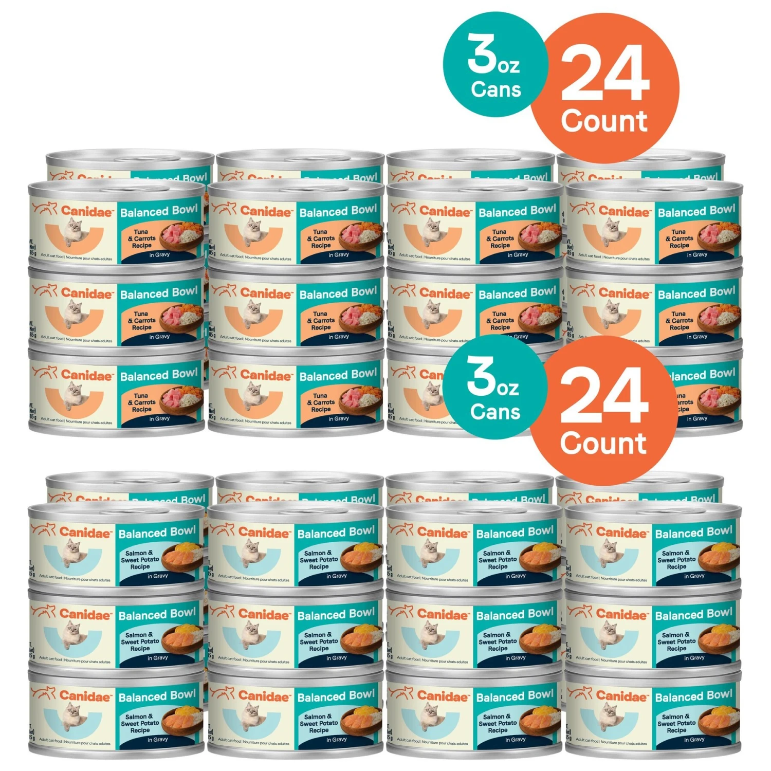 CANIDAE Balanced Bowl Salmon & Sweet Potato Recipe in Gravy Wet Cat Food, 3-oz can, case of 24—Your kitty is bound to find meals whisker-licking good with CANIDAE Balanced Bowl Salmon & Sweet Potato Recipe Wet Cat Food. Crafted with high-quality chicken and vegetables with a healthy dose of gravy, this complete, balanced wet food is purr-fect as a meal or food topper. Plus, it’s free of pesky wheat, corn, soy, and carrageenan! You can’t go wrong with salmon, sweet potato, chicken, and brown rice as staples in your favorite feline’s diet.
