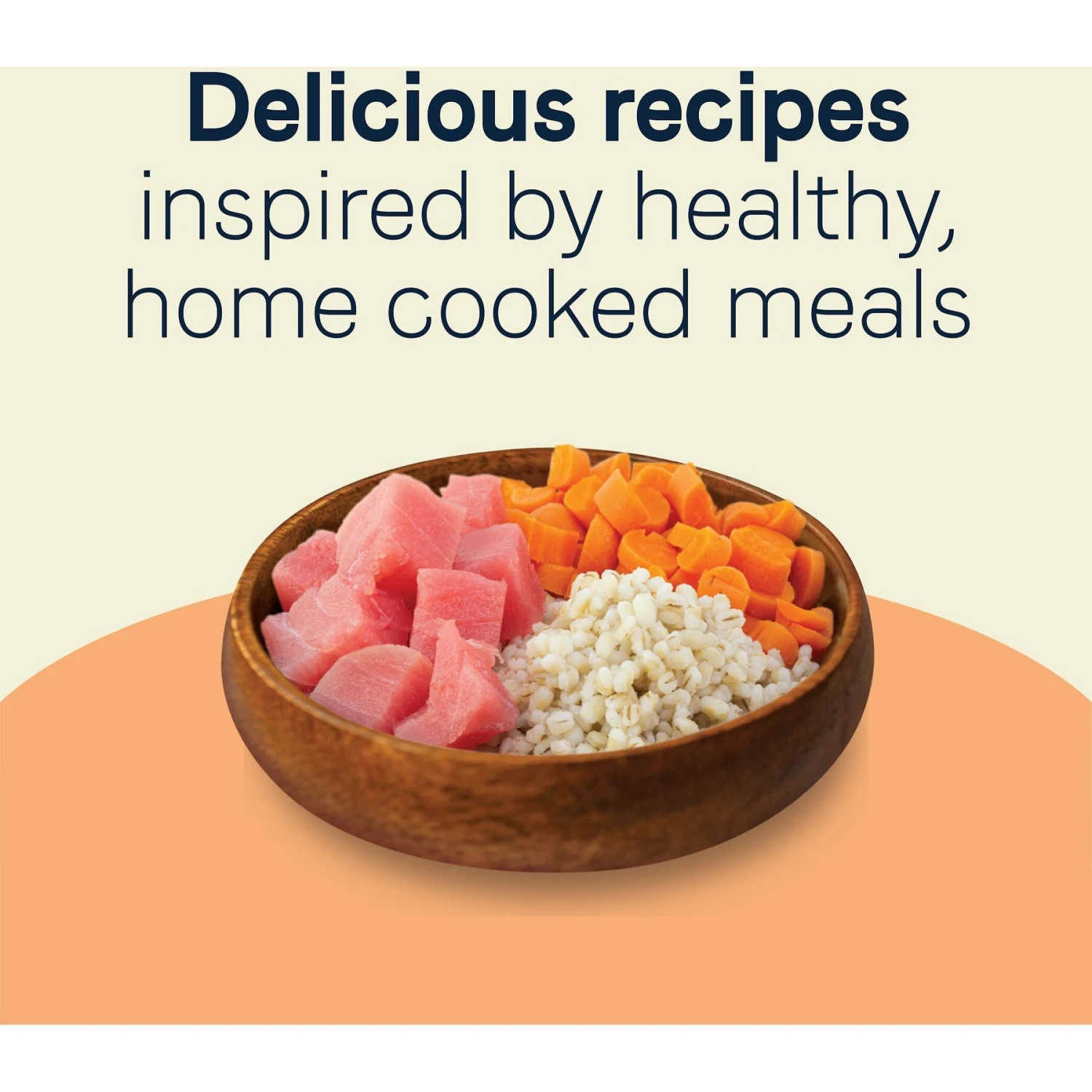 - Crafted with ingredients such as tuna, carrots, chicken, and barley.
