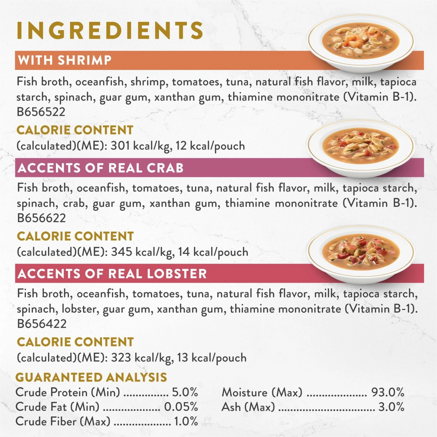 - These premium adult cat food toppers are made with real shrimp, accents of lobster, or real crab in a savory broth.