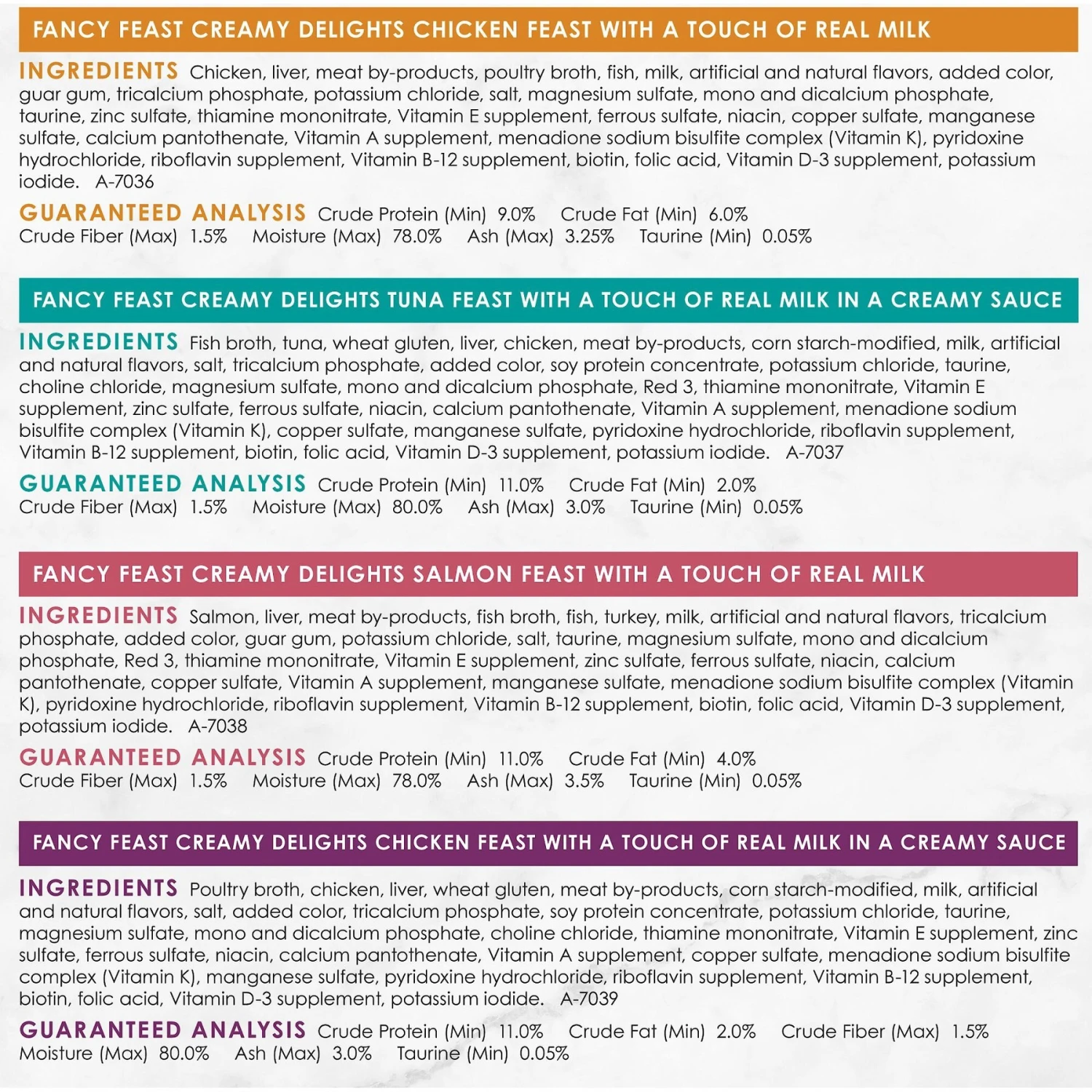 | Flavor | Chicken Feast, Salmon Feast, Variety Pack, Tuna Feast in Creamy Sauce, Chicken Feast in Creamy Sauce |