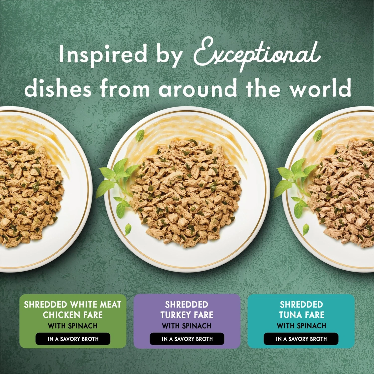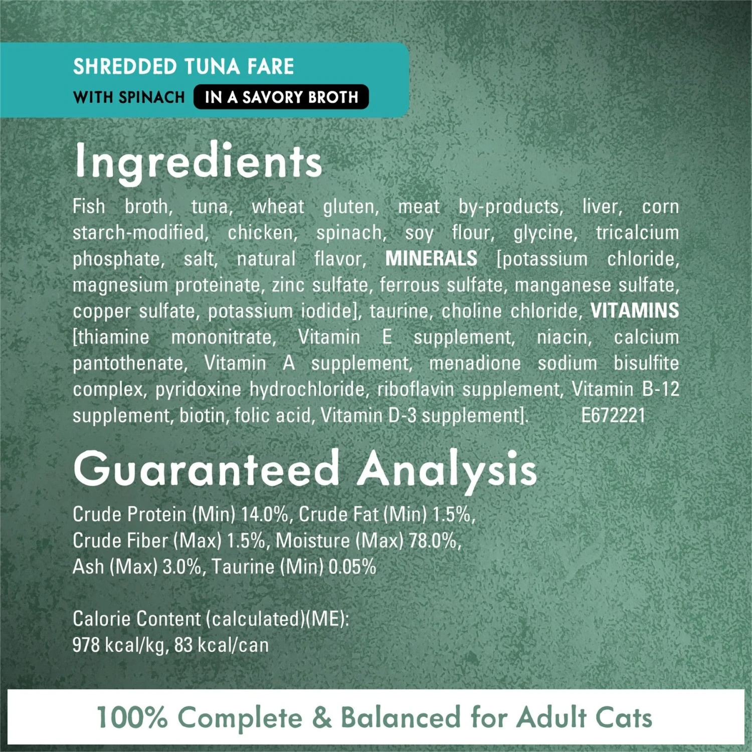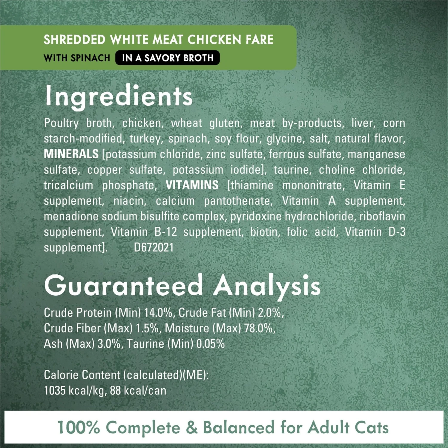 - Canned cat food shreds crafted with real, high-quality ingredients, featuring chicken, tuna or turkey with spinach in a Fancy Feast broth.