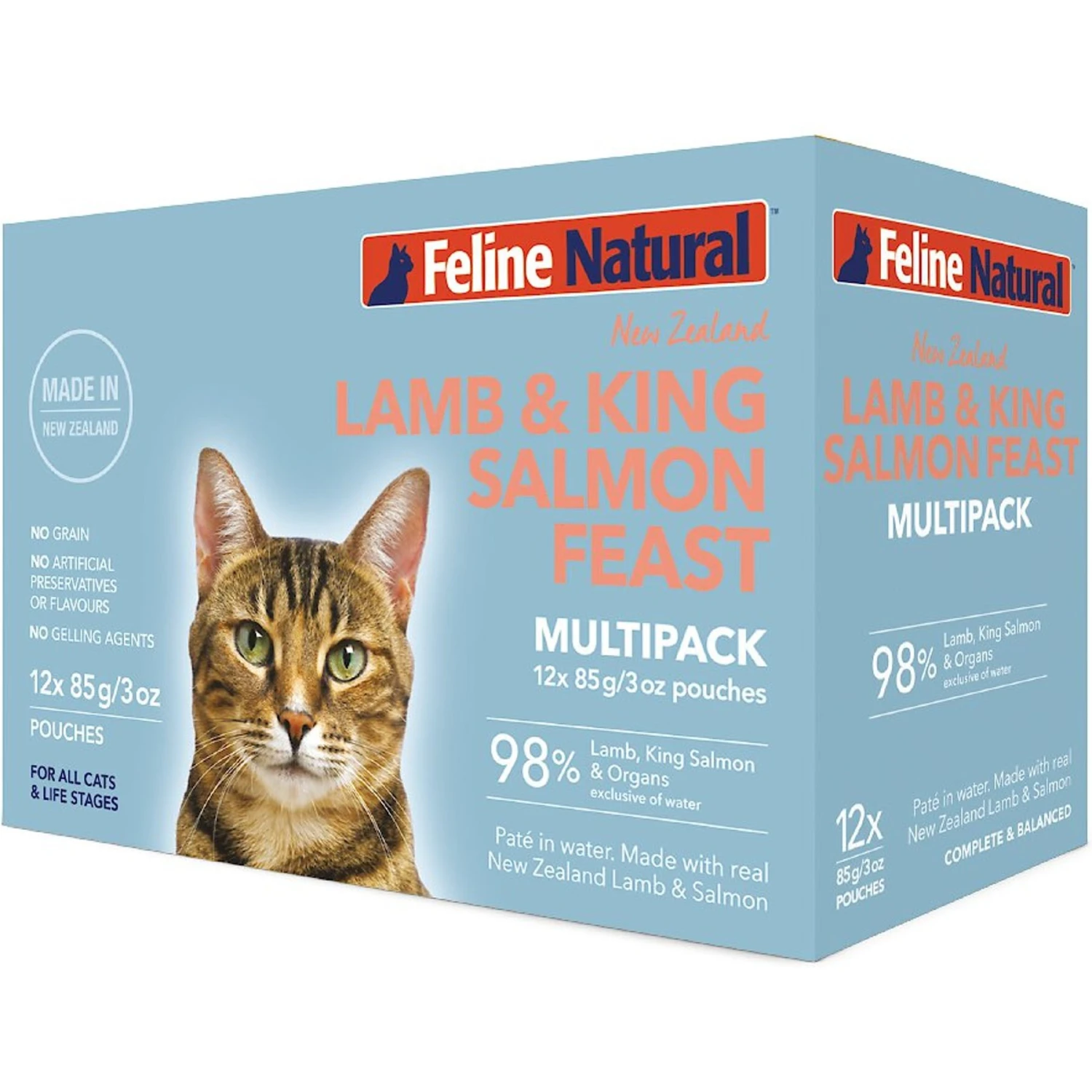 - Grain-free, lamb and salmon flavored cat food pouches that are made in New Zealand.