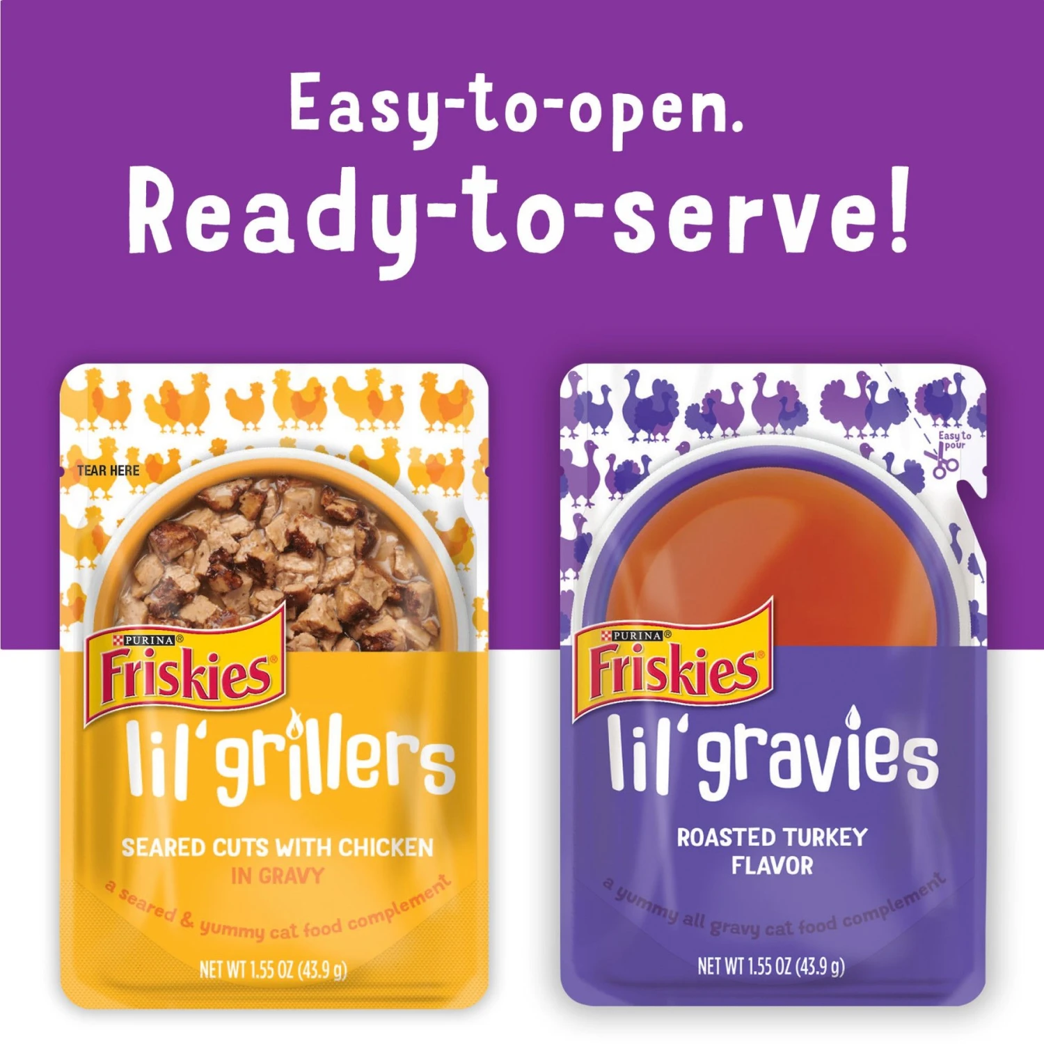 - Let her try Purina Friskies Lil’ Grillers Seared Cuts With Chicken in Gravy and With Ocean Fish in Gravy selections or Friskies Lil’ Gravies Roasted Chicken Flavor and Roasted Turkey Flavor recipes.