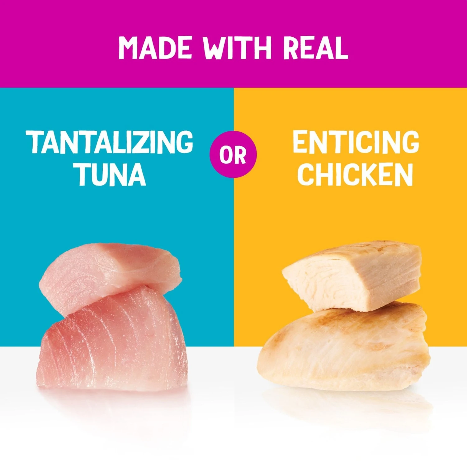 - Kitties choose from two lickable cat food topper recipes, each made with real poultry or fish.