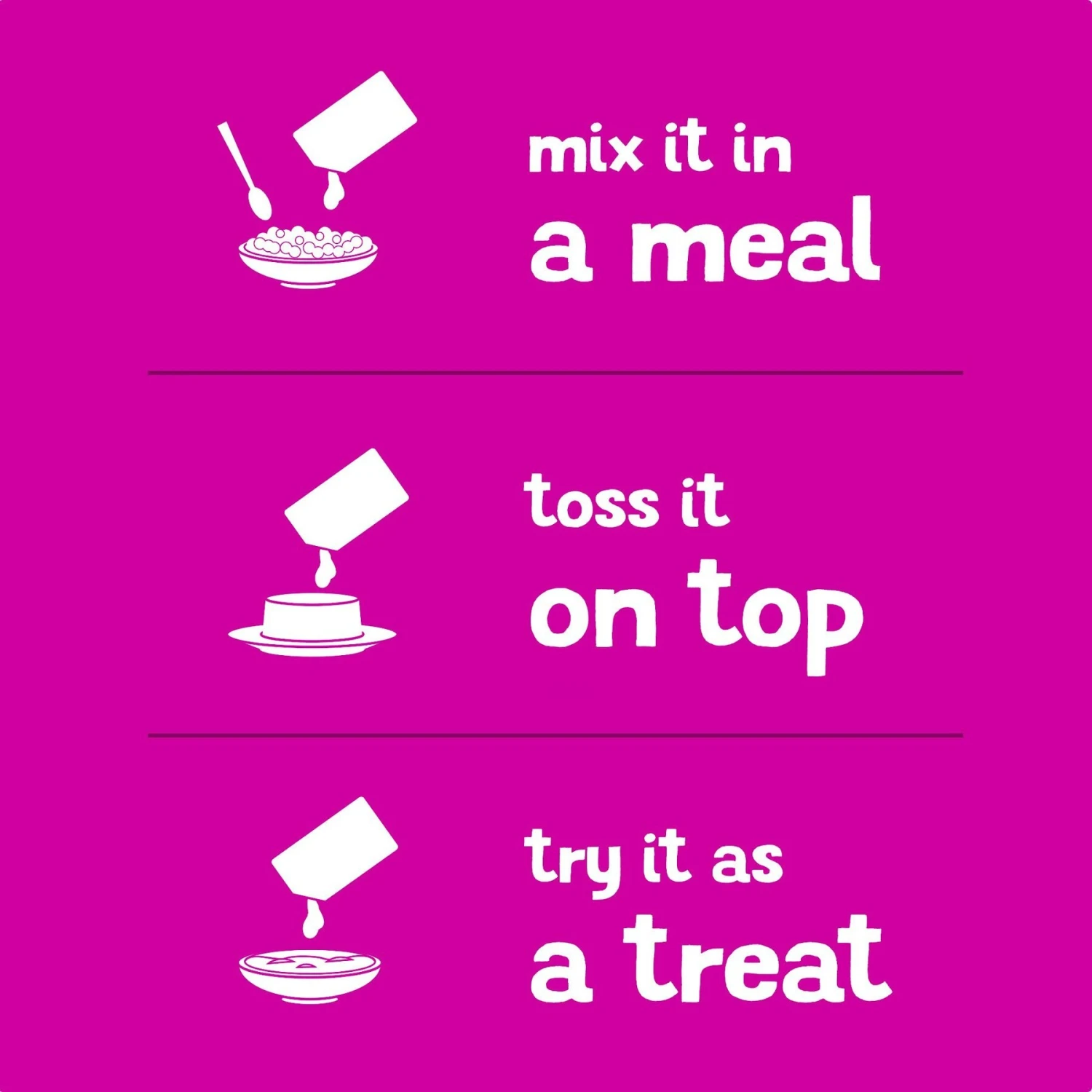 - Serve these pouches as pureed cat food toppers at mealtime or as lickable cat treats anytime—the possibilities are paw-some!