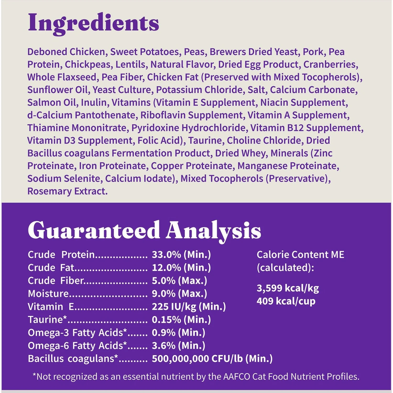 - Premium dry adult cat food made with whole, cage-free, antibiotic-free chicken as the first ingredient.