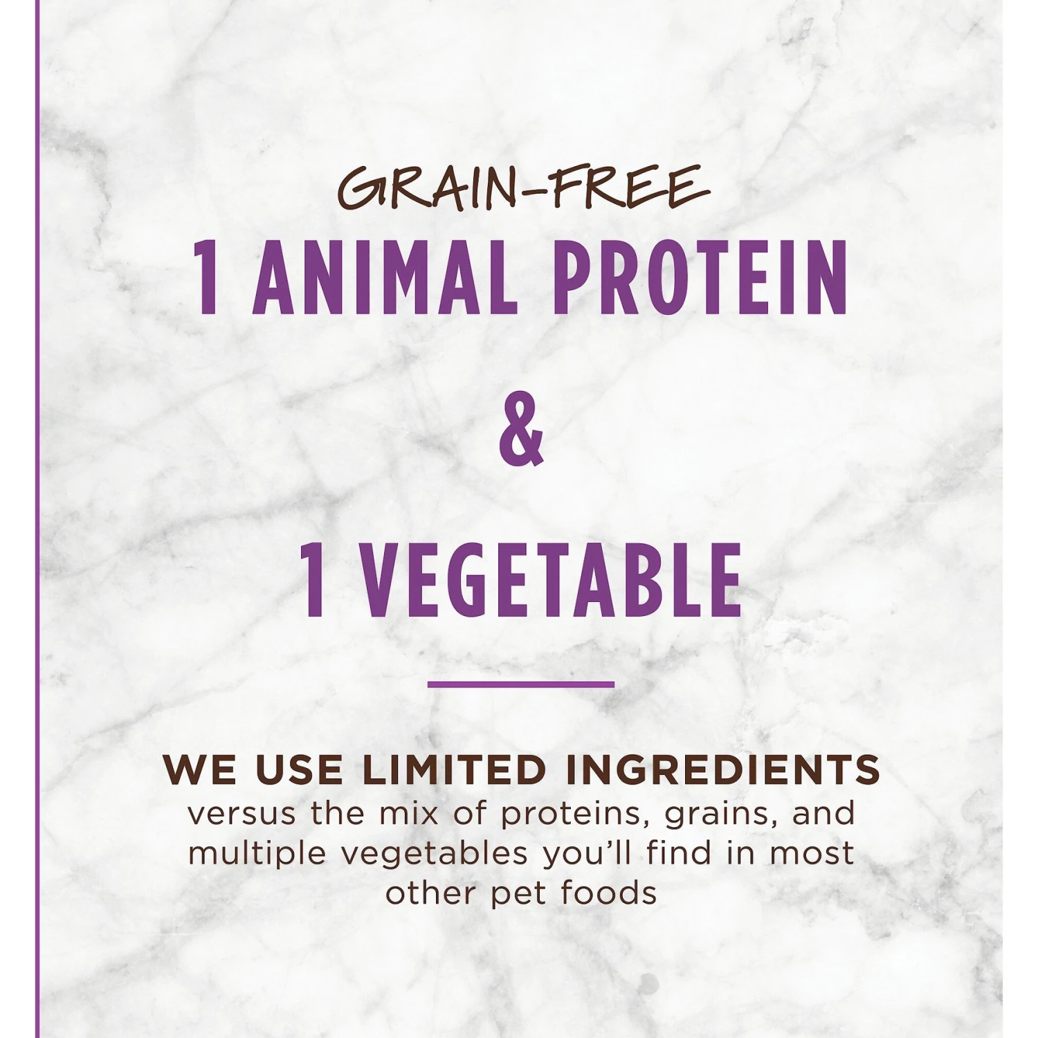 - Features a purposefully simple ingredient list for cats with food sensitivities–just one animal protein and one vegetable.