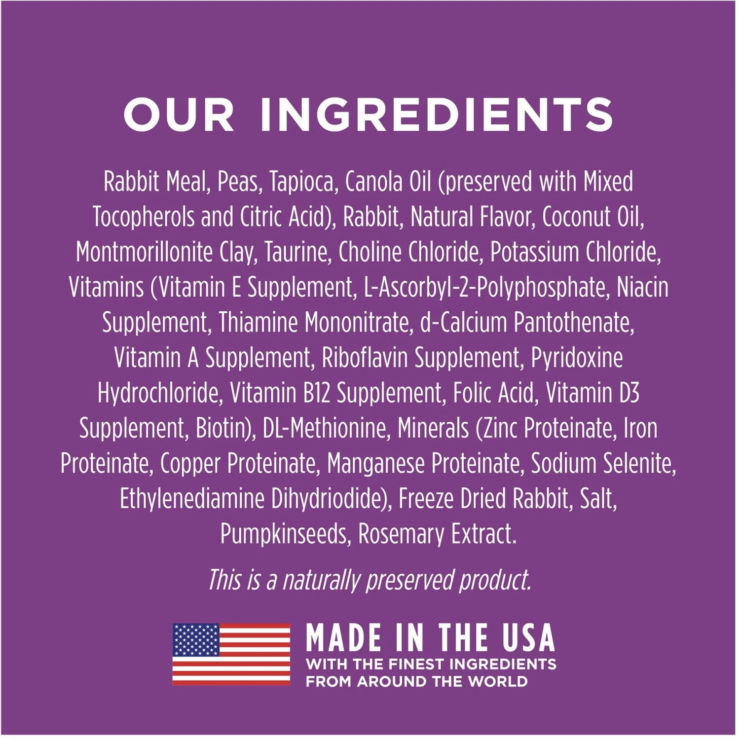 - Made with farm-raised rabbit, an easily digestible protein that provides all the essential amino acids your kitty needs.