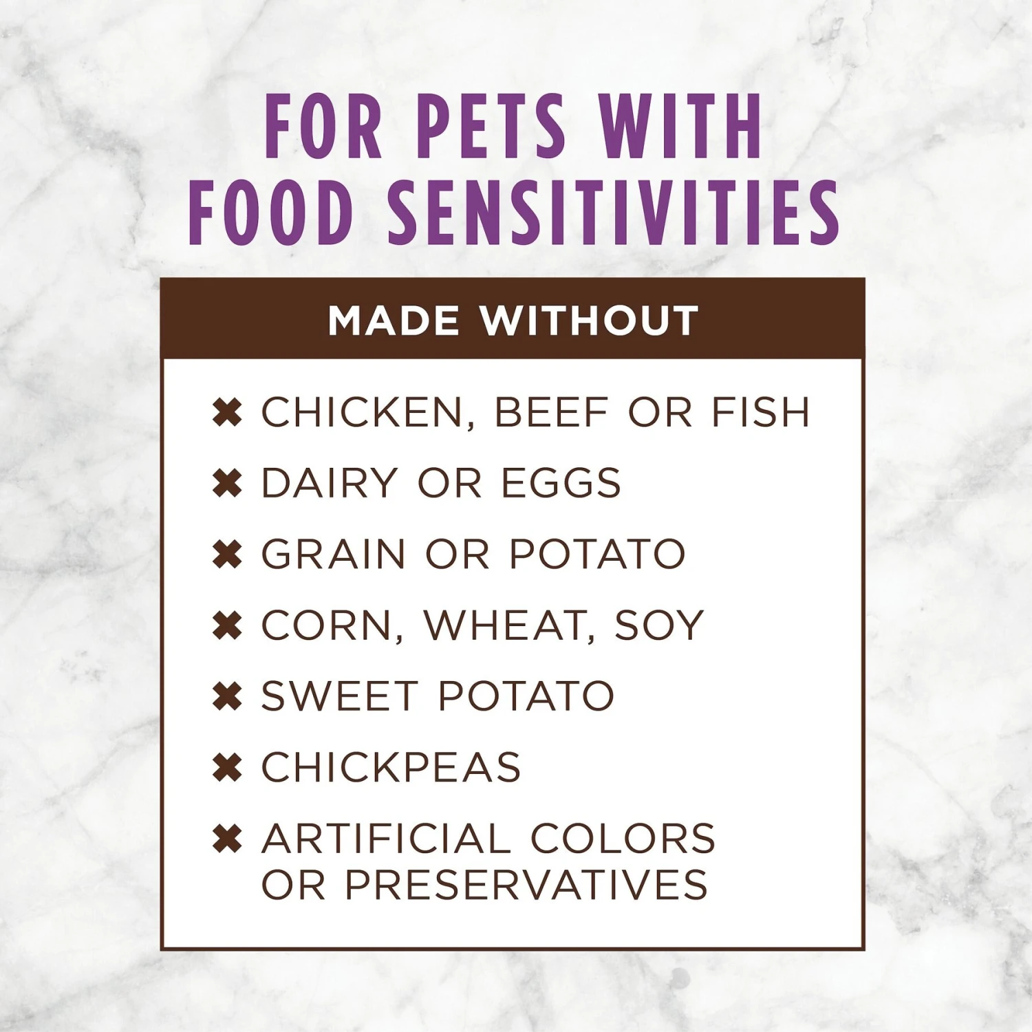 - Never contains any grain, dairy, eggs, chicken, beef, fish, sweet potato, potato, chickpeas, corn, wheat, soy, artificial colors or preservatives.