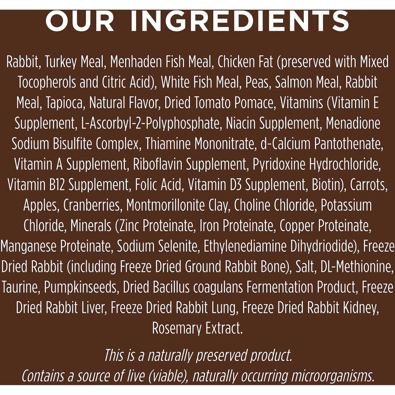 - Farm-raised rabbit is the first ingredient for high animal protein to support strong, lean muscles.