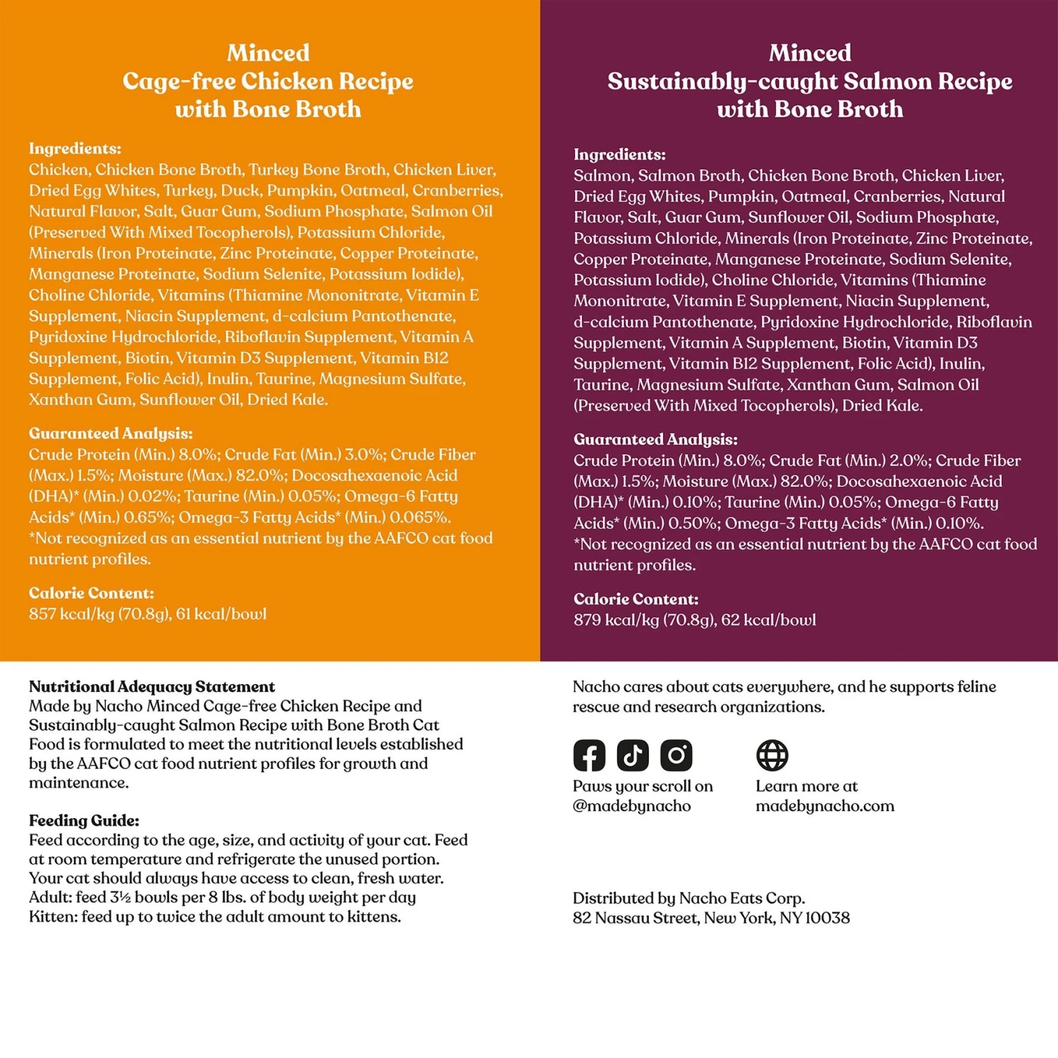 Made by Nacho Minced Recipes With Bone Broth Variety Pack Wet Cat Food, 2.5-oz cup, case of 10—Add some flavorful diversity to your feline gourmand’s menu with Made by Nacho Minced Recipes With Bone Broth Variety Pack Wet Cat Food. Made in the USA, these nutritious meals consist of minced ingredients like cage-free chicken and sustainably caught salmon. Plus, it is doused in a savory bone broth, which gives your feline overlord essential hydration as he feasts. Free of artificial colors, flavors, preservatives, corn, wheat, and soy, these well-balanced wet cat foods are infused with healthy vitamins and minerals like taurine, DHA, prebiotics, Omega-3, and Omega-6, all of which work to keep your precious kitty happy and healthy so he can play, stalk, and cuddle with his favorite human servant all day long!