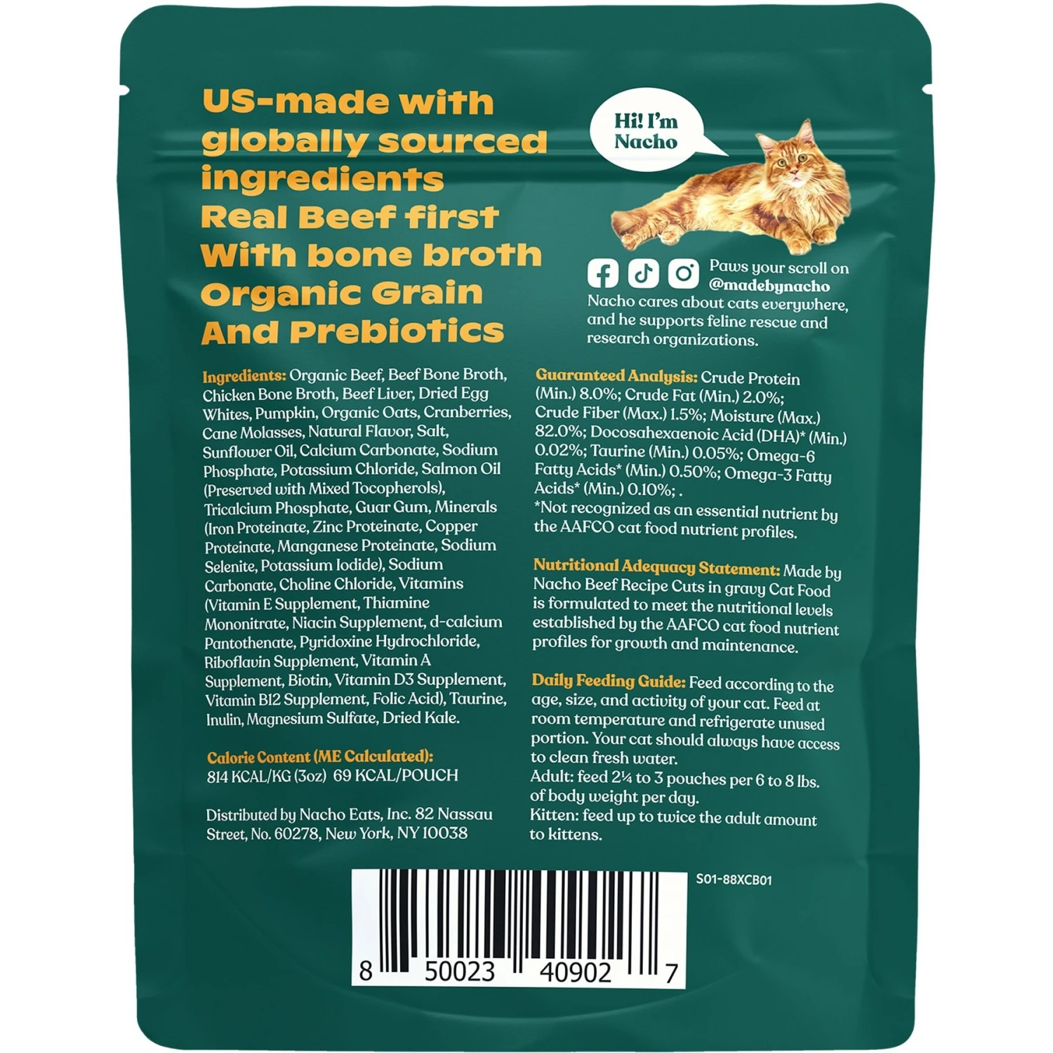 Made by Nacho Grass-Fed, Grain-Finished Beef Recipe Cuts In Gravy With Bone Broth Wet Cat Food, 3-oz pouch, case of 12—Revitalize your feline gourmand’s flavor palate with the wholesome ingredients in Made by Nacho Grass-Fed, Grain-Finished Beef Recipe Cuts In Gravy With Bone Broth Wet Cat Food. Made in the USA, this nutritious meal consists of bold ingredients like grass fed, grain finished beef. Plus, it is doused in a savory gravy with bone broth, which gives your feline overlord essential hydration as he feasts. Free of artificial colors, flavors, preservatives, corn, wheat, and soy, this well-balanced wet cat food is infused with healthy vitamins and minerals like taurine, DHA, prebiotics, Omega-3, and Omega-6, all of which work to keep your precious kitty happy and healthy so he can play, stalk, pounce, and cuddle with his favorite human servant all day long!