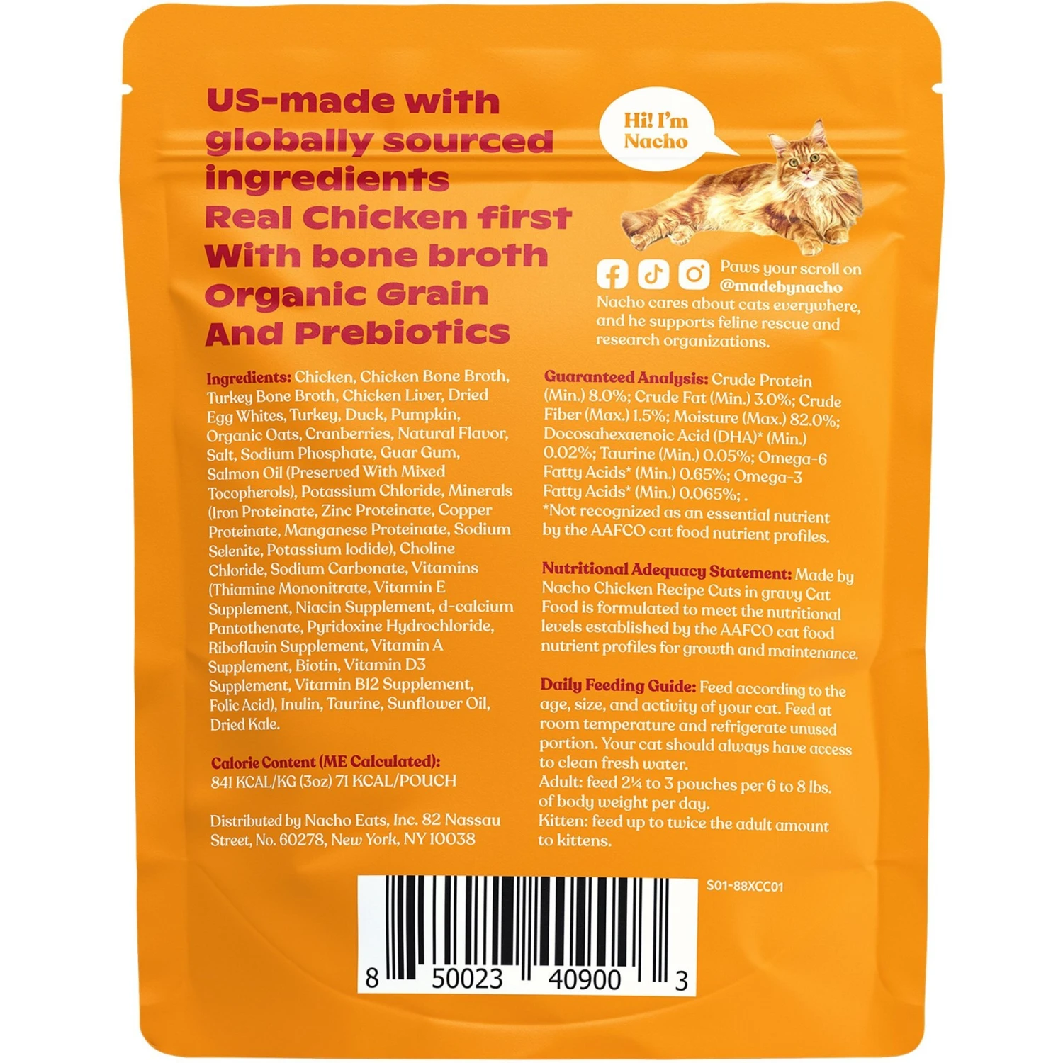 Made by Nacho Cage Free Chicken Recipe Cuts In Gravy With Bone Broth Wet Cat Food, 3-oz pouch, case of 12—Revitalize your feline gourmand’s flavor palate with Made by Nacho Cage Free Chicken Recipe Cuts In Gravy With Bone Broth Wet Cat Food. Made in the USA, this nutritious meal consists of pumpkin and cage free chicken and turkey. Plus, it is doused in a savory bone broth, which gives your feline overlord essential hydration as he feasts. Free of artificial colors, flavors, preservatives, corn, wheat, and soy, this well-balanced wet cat food is infused with healthy vitamins and minerals like taurine, DHA, prebiotics, Omega-3, and Omega-6, all of which work to keep your precious kitty happy and healthy so he can play, stalk, pounce, and cuddle with his favorite human servant all day long!