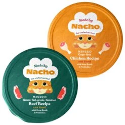 Made by Nacho Grass Fed, Grain-Finished Minced Beef Recipe With Bone Broth Wet Cat Food, 2.5-oz cup, case of 10—Revitalize your feline gourmand’s flavor palate with the wholesome ingredients in Made by Nacho Grass Fed, Grain-Finished Minced Beef Recipe With Bone Broth Wet Cat Food. Made in the USA, this nutritious meal consists of bold ingredients like grass fed, grain finished beef. Plus, it is doused in a savory bone broth, which gives your feline overlord essential hydration as he feasts. Free of artificial colors, flavors, preservatives, corn, wheat, and soy, this well-balanced wet cat food is infused with healthy vitamins and minerals like taurine, DHA, prebiotics, Omega-3, and Omega-6, all of which work to keep your precious kitty happy and healthy so he can play, stalk, pounce, and cuddle with his favorite human servant all day long!