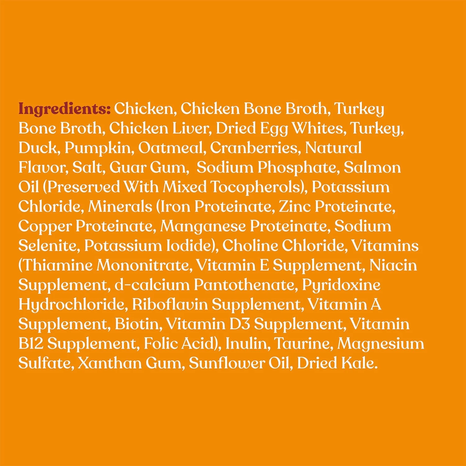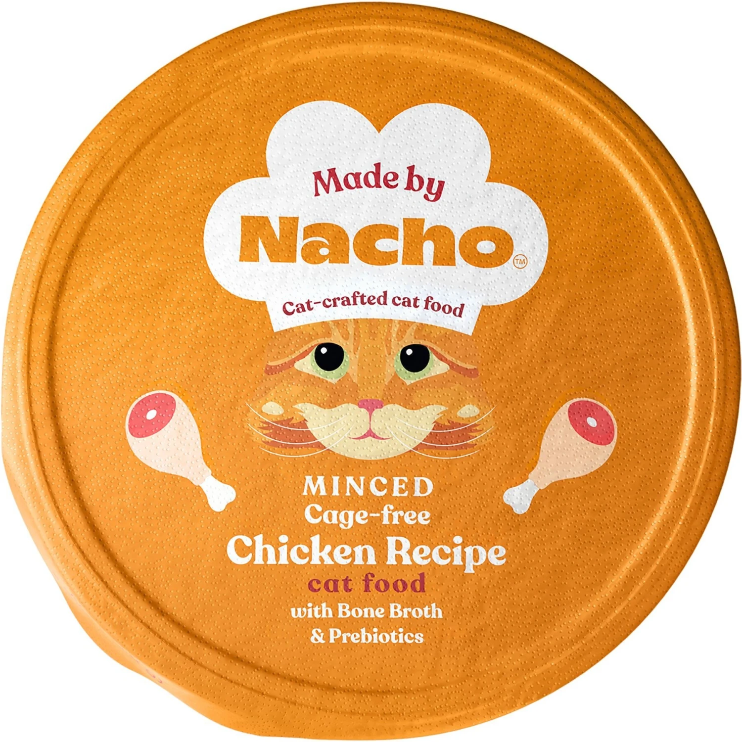 Made by Nacho Cage Free Minced Chicken Recipe With Bone Broth Wet Cat Food, 2.5-oz cup, case of 10—Revitalize your feline gourmand’s flavor palate with Made by Nacho Cage Free Minced Chicken Recipe With Bone Broth Wet Cat Food. Made in the USA, this nutritious meal consists of pumpkin, minced cage-free chicken, turkey, and duck. Plus, it is doused in a savory bone broth, which gives your feline overlord essential hydration as he feasts. Free of artificial colors, flavors, preservatives, corn, wheat, and soy, this well-balanced wet cat food is infused with healthy vitamins and minerals like taurine, DHA, prebiotics, Omega-3, and Omega-6, all of which work to keep your precious kitty happy and healthy so he can play, stalk, pounce, and cuddle with his favorite human servant all day long!