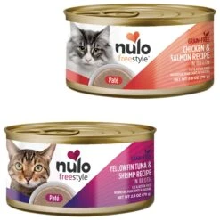 Nulo FreeStyle Yellowfin Tuna & Shrimp Pate Wet Cat Food, 2.8-oz can, case of 12—Serve your feline gourmand the flavors he craves with Nulo FreeStyle Cat & Kitten Yellowfin Tuna & Shrimp Pate. This smooth, elegant pate is crafted with real yellowfin tuna, shrimp and other wholesome ingredients that provide your cat or kitten with essential nutrients. The broth-based gravy helps keep your feline friend hydrated while the high protein content keeps him content after each meal. The pate is finely blended into a soft, manageable texture and delectable taste. The single-serve meals come with easy-open tops so cat servants can easily serve meals right on schedule.