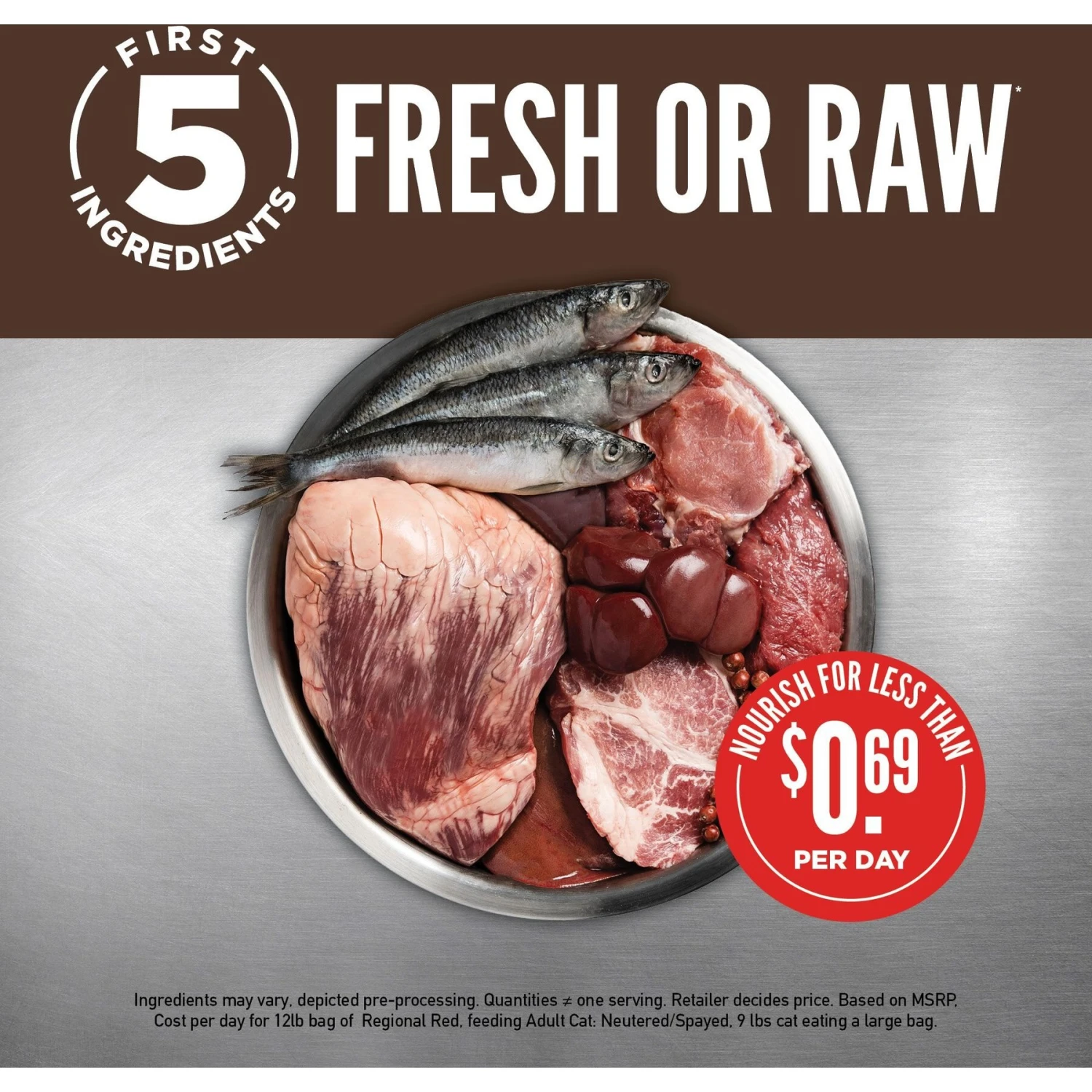 - The first five ingredients of this high-protein ORIJEN cat food are fresh or raw animal ingredients, including beef, pork, whole mackerel, beef liver and wild boar.