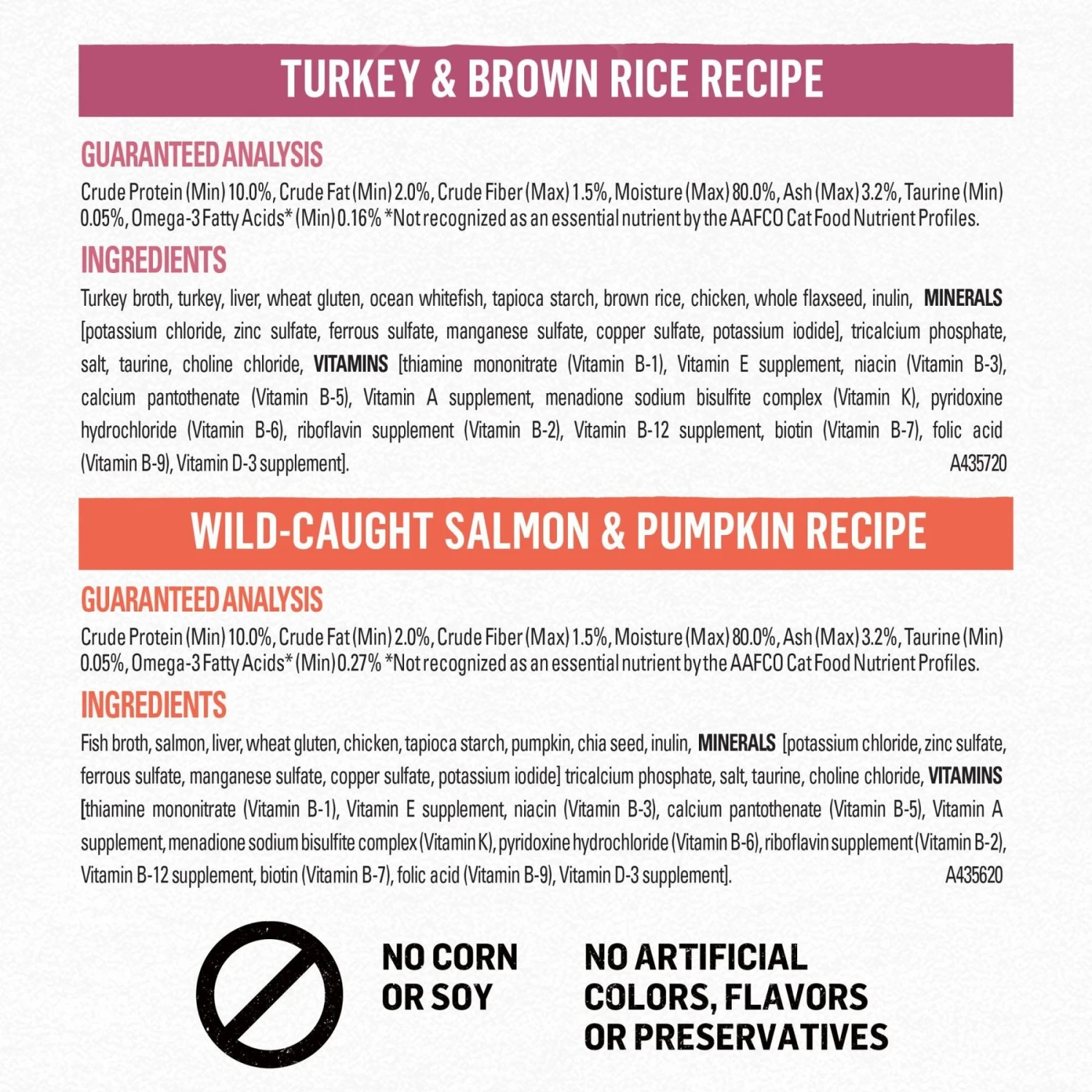 - Bring fun to her bowl with cat-tastic variety—this wet cat food variety pack contains four pouches each of Wild-Caught Salmon & Pumpkin Recipe and Turkey & Brown Rice Recipe.
