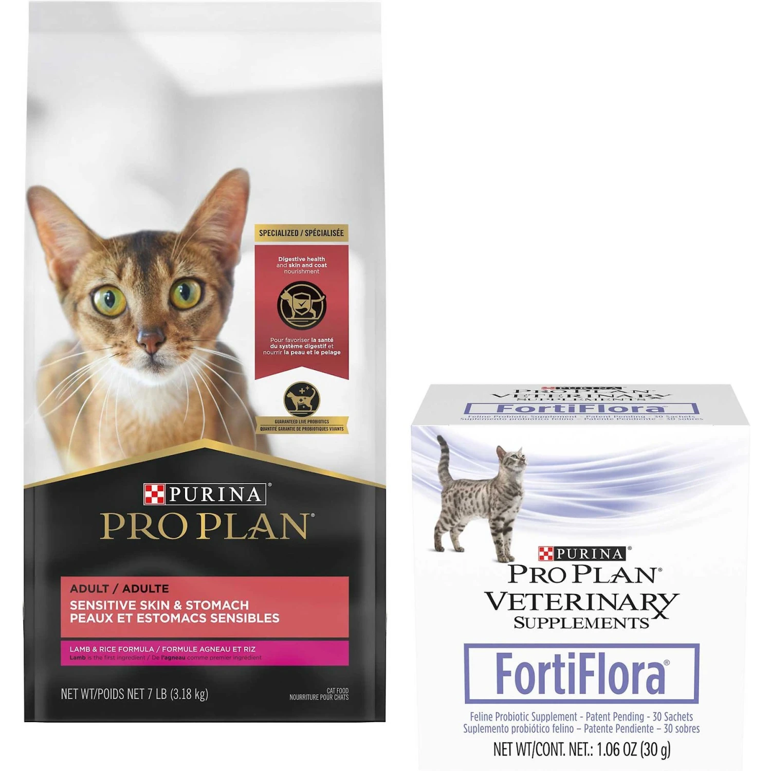 This item used to be known as Purina Pro Plan FOCUS. As this item transitions, you may receive either bag. Purina Pro Plan Adult Sensitive Skin & Stomach Lamb & Rice Formula Dry Food + Veterinary Diets FortiFlora Probiotic Gastrointestinal Support Cat Supplement is the perfect combo for a cat’s sensitive digestive system. Give your fuzzy feline the specialized cuisine she needs with Purina Pro Plan Lamb & Rice Formula. This tasty dry food for cats is formulated to be high in protein and ideal for your sidekick’s sensitive skin and stomach. It features real lamb as the very first ingredient as well as easily digestible rice and oatmeal. This super premium adult cat food is fortified to provide digestive and immune support with live probiotics and natural prebiotic fiber just for your pet pal. It also contains omega-6 fatty acids and vitamin A to nourish your cuddly companion’s skin and coat as a part of a 100% complete and balanced diet. Once they’re done eating, help settle your sidekick’s sensitive stomach with Purina Pro Plan Veterinary Supplements FortiFlora Feline Probiotic Supplements. This great-tasting probiotic supplement powder is specially formulated to promote normal intestinal microflora in cats suffering from diarrhea. It is crafted in collaboration with nutritionists, researchers and veterinarians to contain a specific amount of live microorganisms to help support digestive health. This probiotic supplement powder is paw-fect for all breeds of cats in any stage of life and is developed using a proprietary microencapsulation process for enhanced stability!