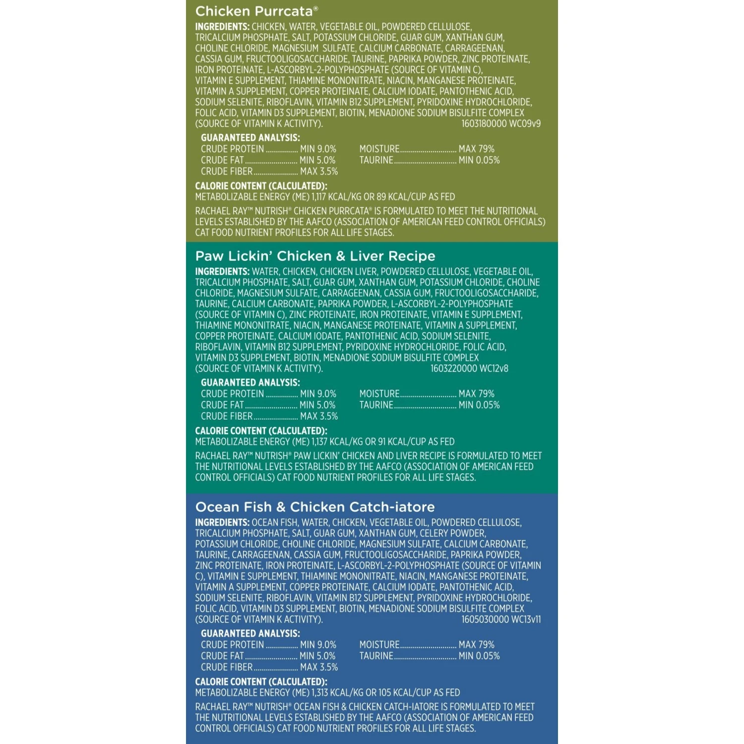 - Variety pack includes Chicken Purrcata, Ocean Fish & Chicken Catch-iatore, and Paw Lickin’ Chicken & Liver
