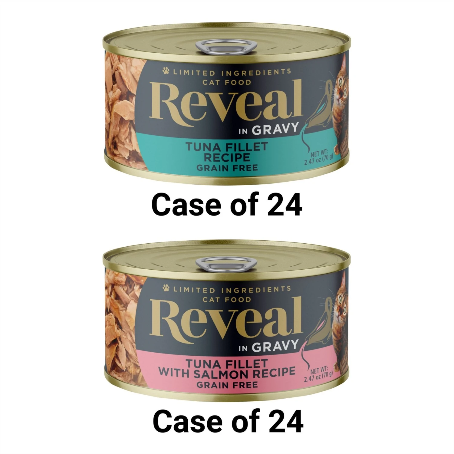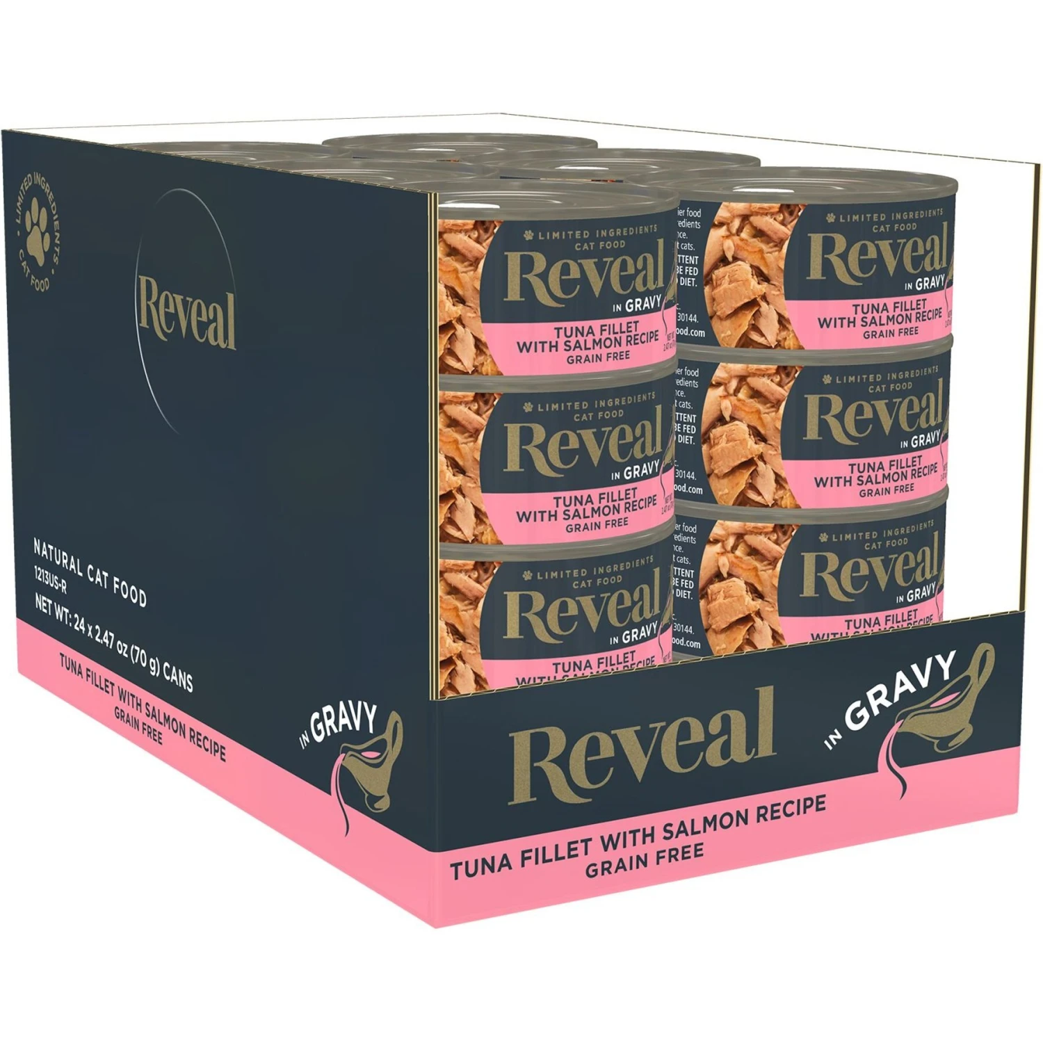 Reveal Natural Grain-Free Tuna with Salmon in Gravy Flavored Wet Cat Food, 2.47-oz can, case of 24—Reveal Natural Wet Cat Food is packed with real tuna fillet and salmon for paw-some protein. Crafted with limited ingredients, this grain-free food is purr-fect for kitties with food sensitivities. It’s free of artificial colors, flavors, preservatives and other bad stuff. Instead, it’s made with delicious, natural ingredients your furbaby will love. You can feed this wet food as a compliment to any dry food (sold separately) for a complete and balanced diet.