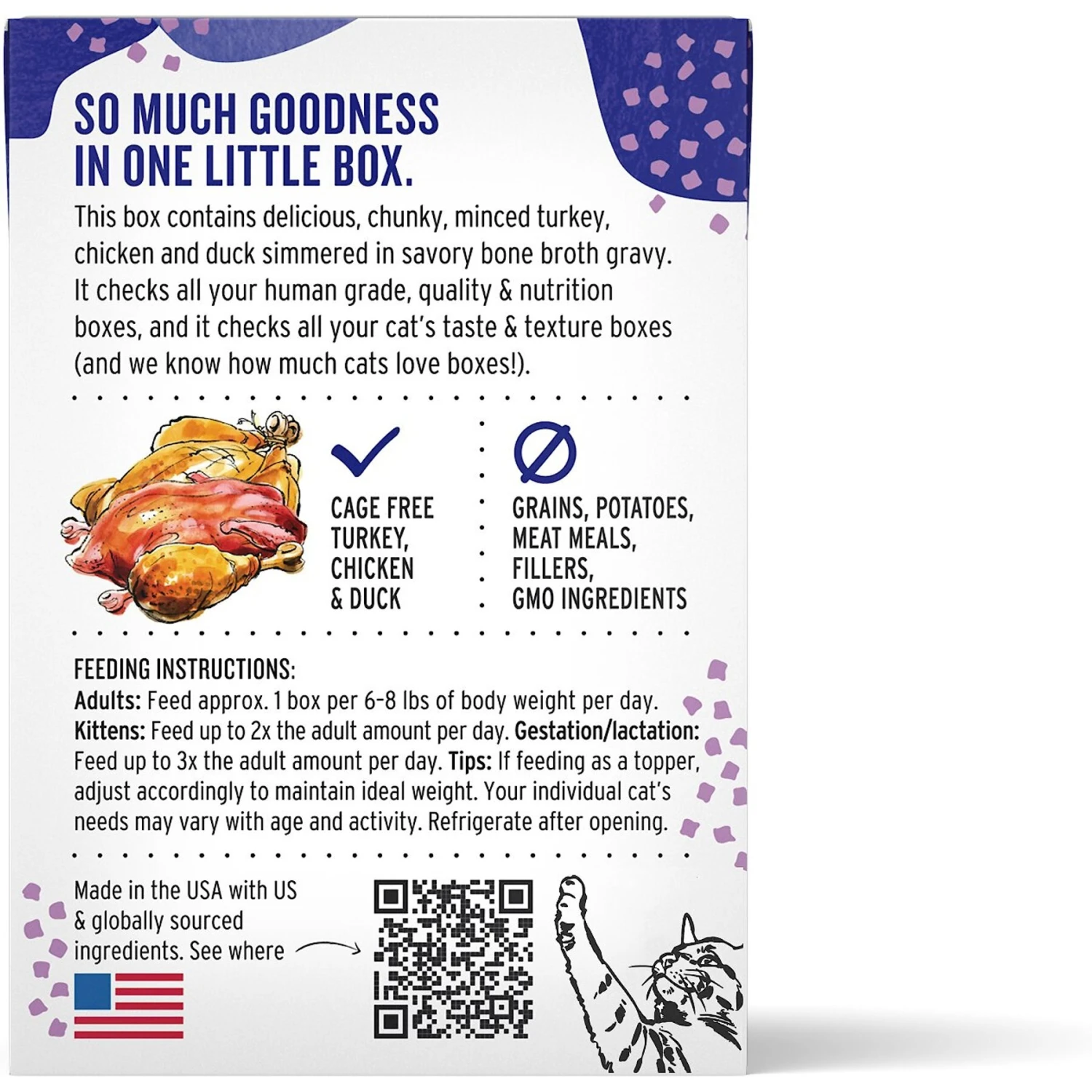 - Made from minced whole muscle and organ meats from cage-free turkey, chicken and duck in a savory bone broth gravy to stimulate your kitty’s carnivorous appetite!