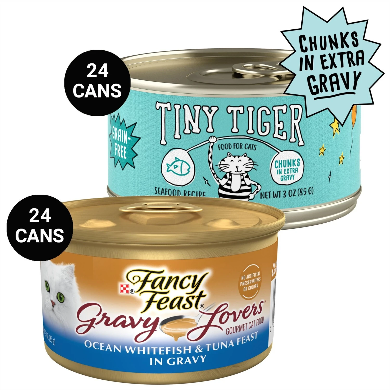 Be the first to review “Tiny Tiger Chunks In EXTRA Gravy Seafood Recipe Grain-Free Canned Cat Food & Fancy Feast Gravy Lovers Ocean Whitefish & Tuna Feast In Sauteed Seafood Flavor Gravy Canned Cat Food” Cancel reply