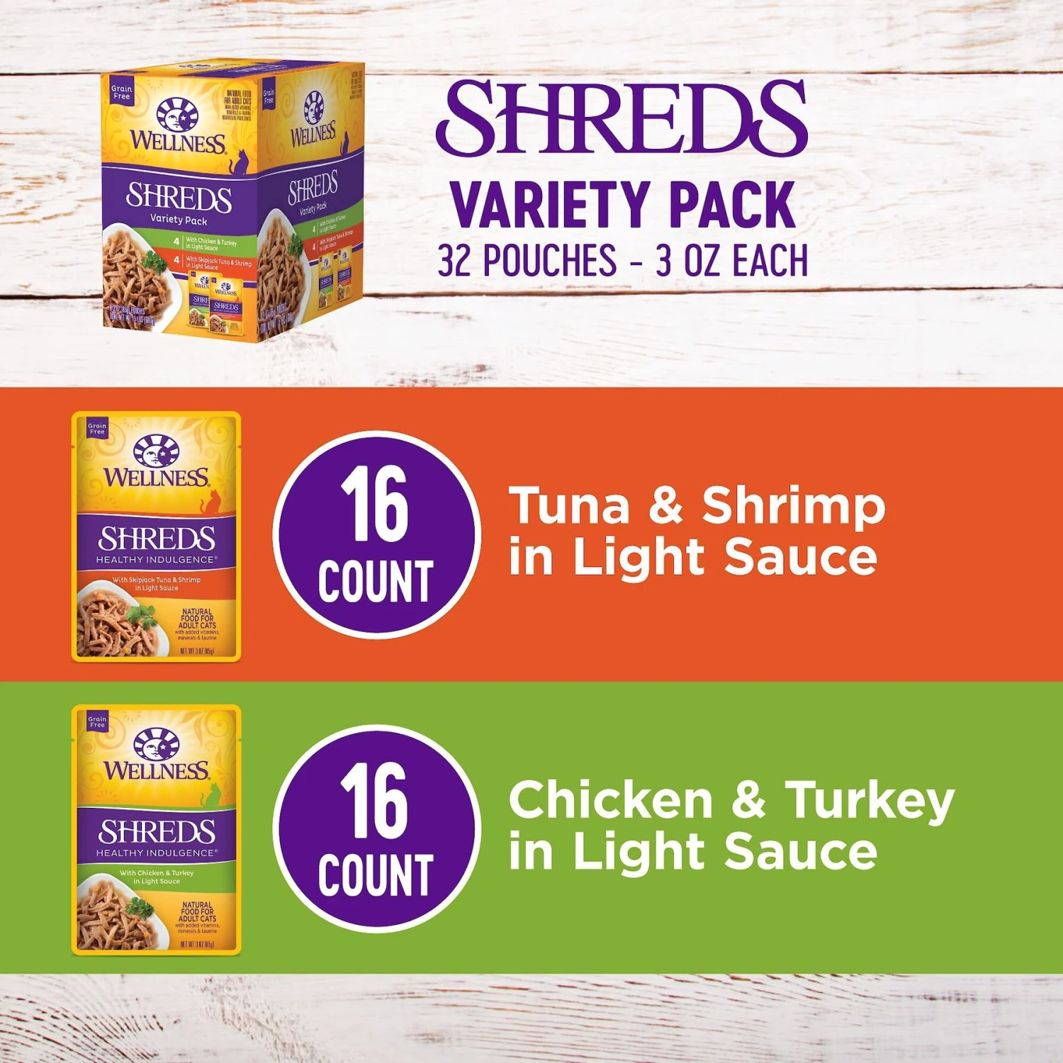 | Flavor | Chicken & Turkey, Tuna & Shrimp, Variety Pack: Tuna & Shrimp and Chicken & Turkey |