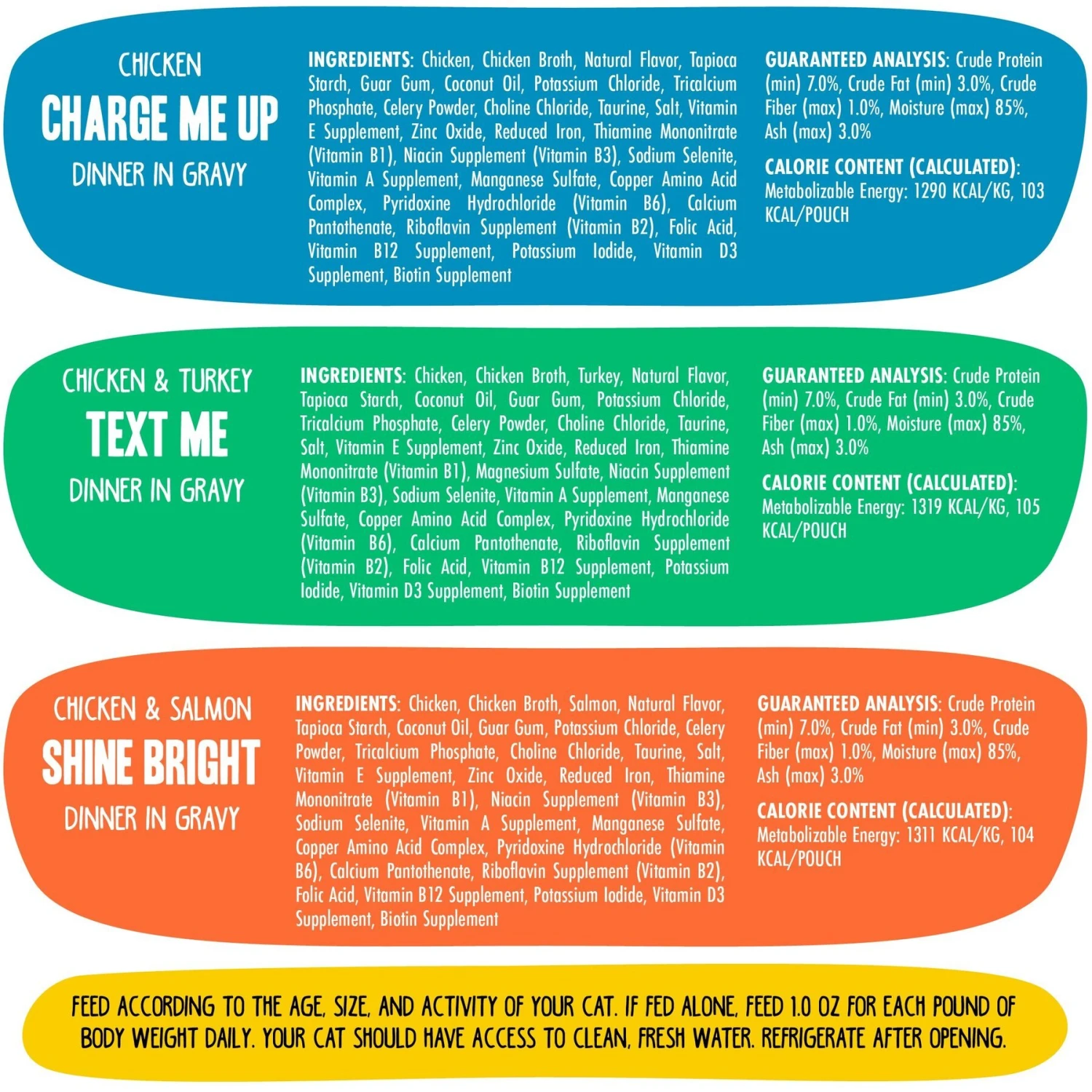 - 3 scrumptious all-natural wet cat food recipes crafted with real, cage-free chicken in a lip-smacking gravy.