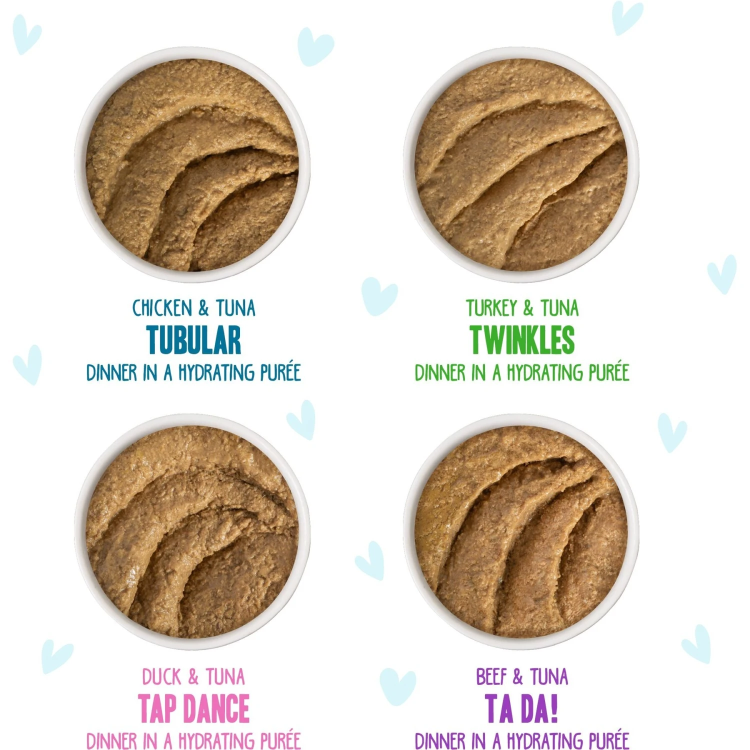 - Includes 3 packs each of Tuna & Chicken Chill Out, Tuna & Salmon Shhh…, Tuna & Beef Blast Off! and Tuna & Turkey Totes!—each recipe pureed into a mouth-watering, indulgent pate.