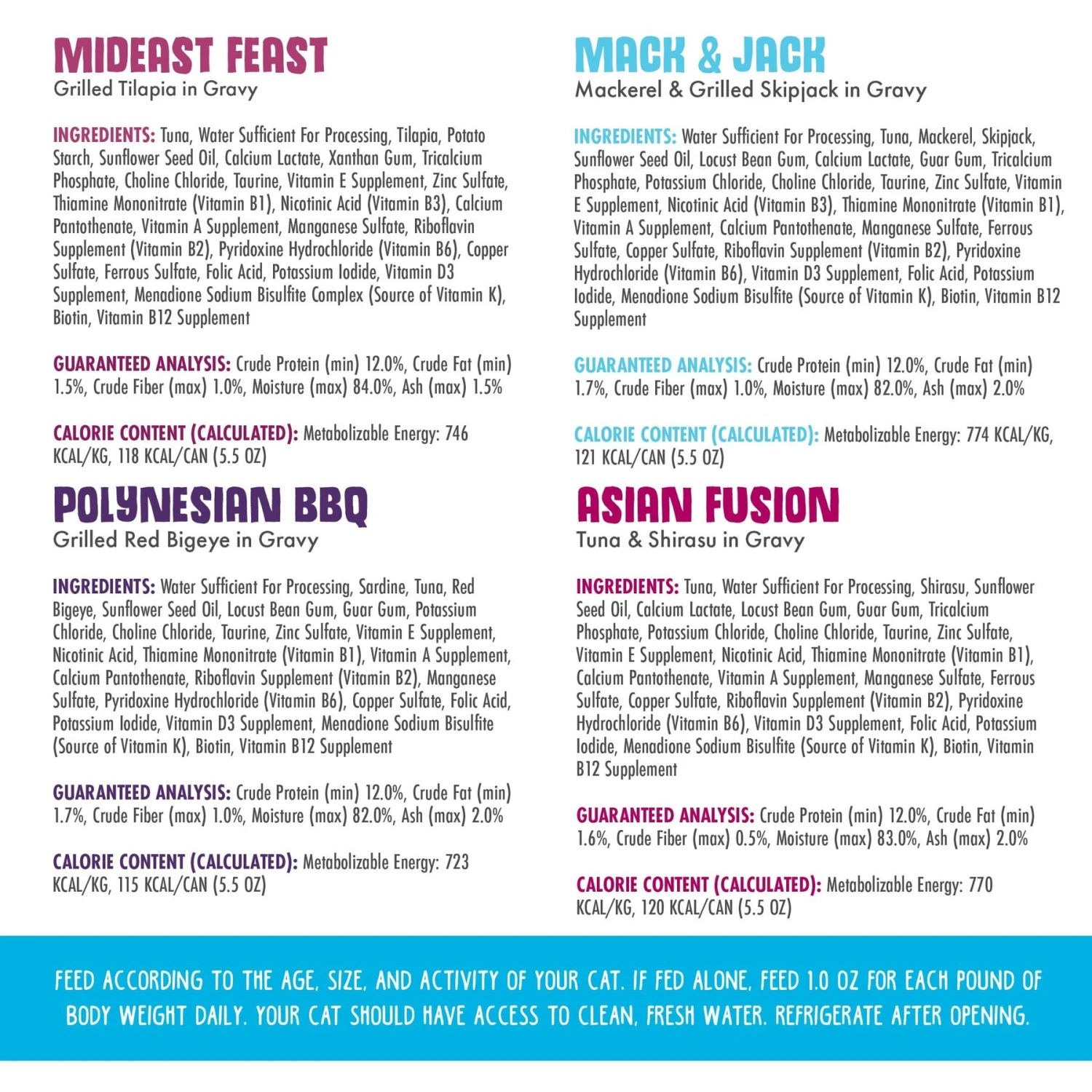 | Flavor | Green Eggs & Chicken, The 10 Ounce Pounce Pack, Chicken Gone Fishin' Pack, Polynesian BBQ, Mack and Jack, Amazon Livin, Meow Luau, Asian Fusion, Holy Chicken Mackerel Pack, Marbella Paella, Grandma's Chicken Soup, Mideast Feast, Paw Lickin' Pals Pack, Paw Lickin' Chicken, Frisky Fishin' Friends Pack, Funky Chunky Chicken Soup, Outback Grill |