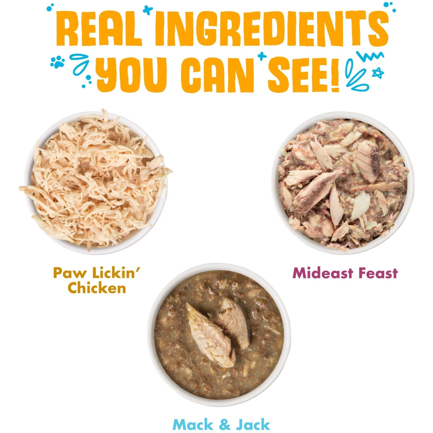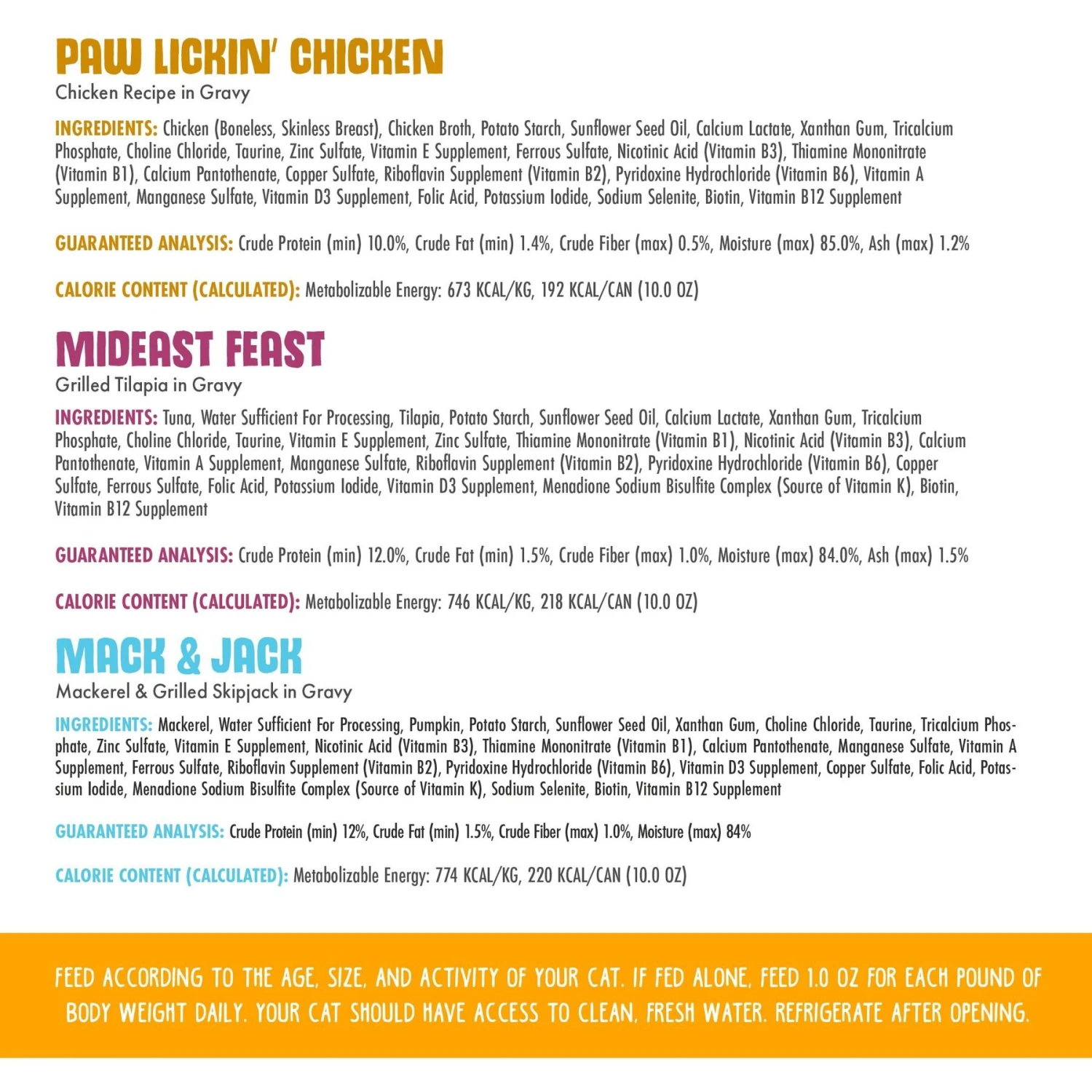 | Flavor | Green Eggs & Chicken, The 10 Ounce Pounce Pack, Chicken Gone Fishin' Pack, Polynesian BBQ, Mack and Jack, Amazon Livin, Meow Luau, Asian Fusion, Holy Chicken Mackerel Pack, Marbella Paella, Grandma's Chicken Soup, Mideast Feast, Paw Lickin' Pals Pack, Paw Lickin' Chicken, Frisky Fishin' Friends Pack, Funky Chunky Chicken Soup, Outback Grill |