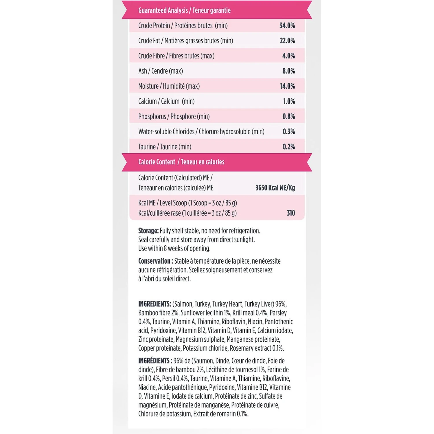 - High-protein low-fat formula is made with 96% turkey, salmon and organ meat.